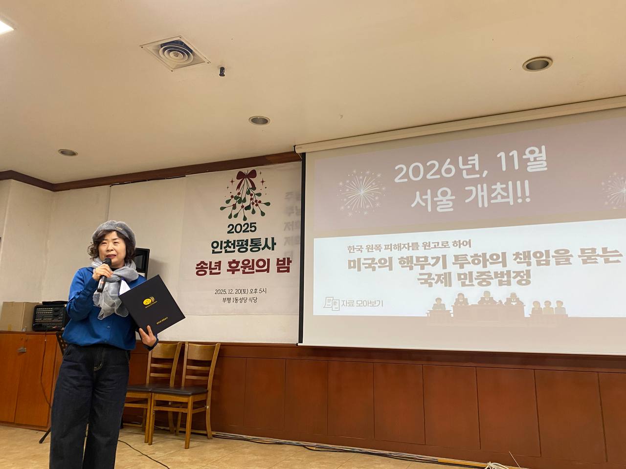 작년 이 자리에서 한마음으로 외쳤던 윤석열 탄핵의 목소리, 빛의 혁명으로 새로운 정부를 세웠지만 한반도의 자주와 평화, 통일의 길은 여전히 우리 앞에 놓여 있습니다. 원폭 80년, 광복·분단 80년, 대결과 분단의 선 너머에서 작은 희망을 품었던 순간들, 그 모든 발걸음이 모여 오늘의 평화 통일의 길을 열어 왔습니다. 어려움속에서도 올 한해 인천평통사와 함께해 주신 모든 분들께 진심으로 감사드립니다.