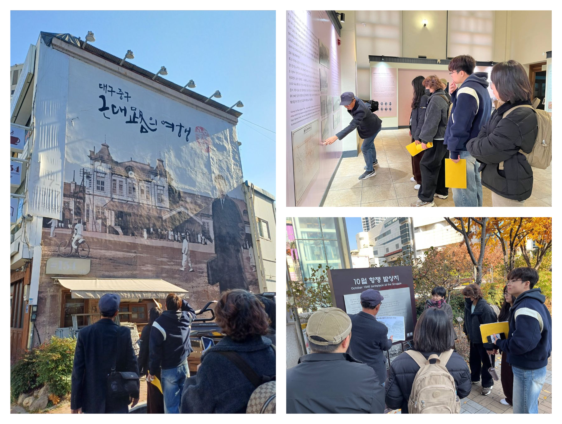 대구 근대역사기념관과 대구역 앞 10월 항쟁 발상지에서 해설을 듣고 있는 청년, 청소년들