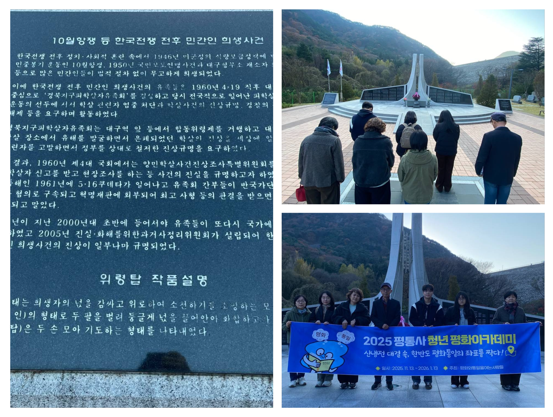 미군정은 경찰력을 동원하여 항쟁을 강경하게 진압했습니다. 이 과정에서 수많은 희생자가 발생하고 많은 사람이 체포되었습니다. 특히 희생자들은 가창골 일대에서 많이 학살되고 매장된 비극적인 역사의 현장입니다. 이런 비극의 역사를 위로하고 하루빨리 분단으로 인한 피해가 더이상 생기지 않도록 하고 희생자들의 넋을 기리기 위해 2020년 11월에 건립된 가창골 위령탑은 1946년 대구 10월 항쟁과 한국전쟁 전후에 군경(軍警)에 의해 억울하게 희생된 민간인들을 추모하기 위해 건립된 시설입니다. 이곳에서 참가자들은 소감을 나누며 '다시는 이런 비극이 생기지 않도록 주변 친구들에게도 많이 알리겠다', '다시한번 현장의 중요함을 느낀다. 책이나 말을 통해서는 느끼지 못하는 그 날의 아픔이 느껴져 다시 마음가짐을 다지게 된다.'며 앞으로도 분단을 끝내고 하루빨리 평화통일의 길로 나아갈 수 있도록 힘써보자는 결의를 다지며 대구아카데미를 마무리 했습니다.