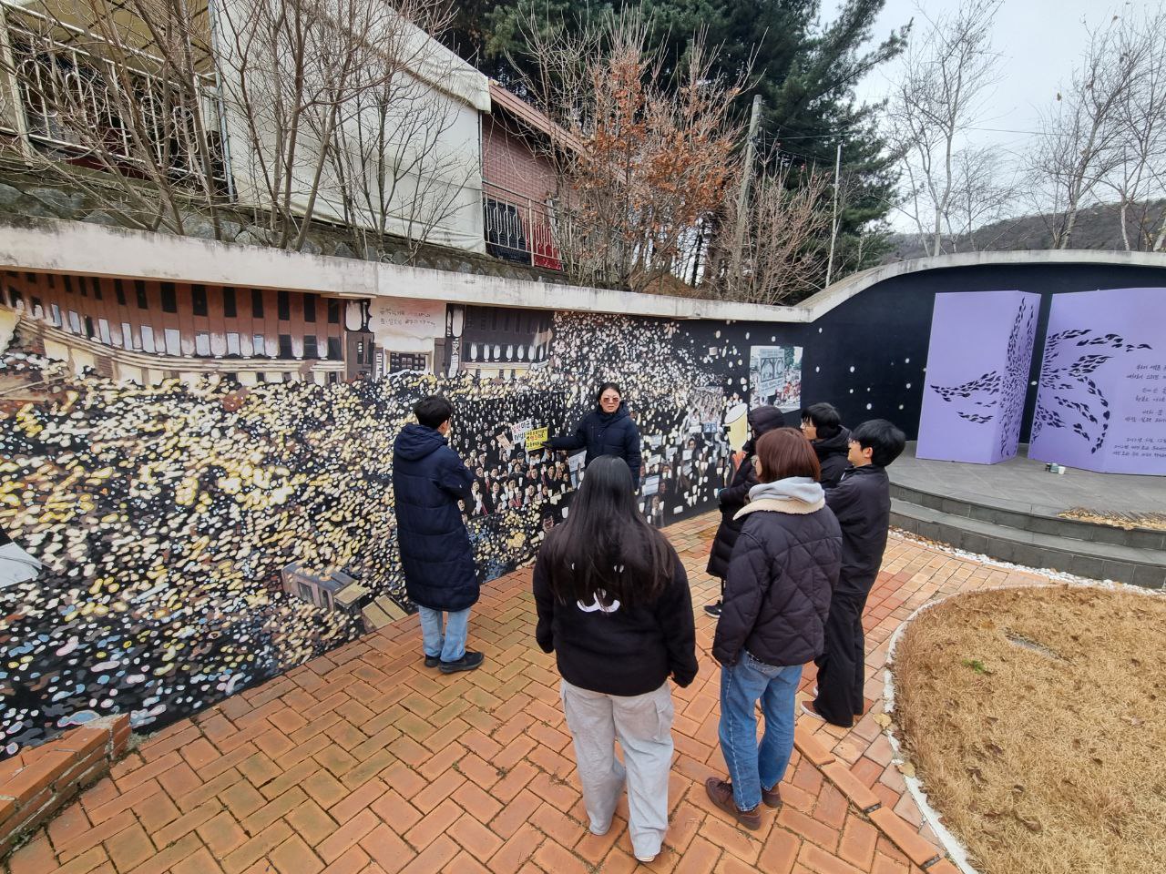 효순미선평화공원에서 벽화의 의미에 대해 설명을 듣고 있다.