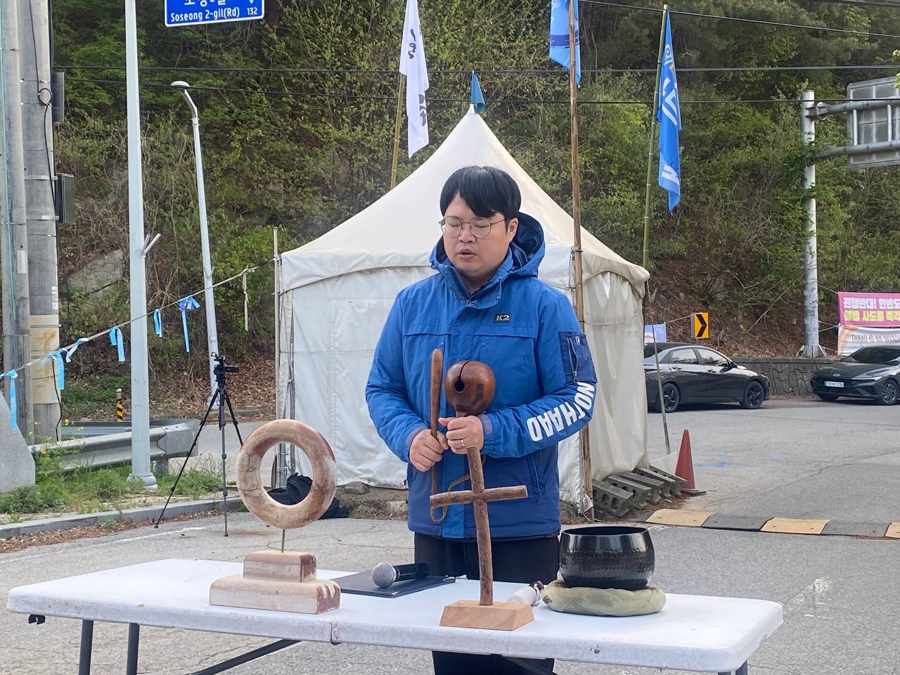 오전 7시: 강현욱 교무가 주도하는 원불교 평화법회를 진행합니다. 법회 중에 공사 인부와 장비가 들어가자 자리에서 일어나 힘차게 구호를 외칩니다.