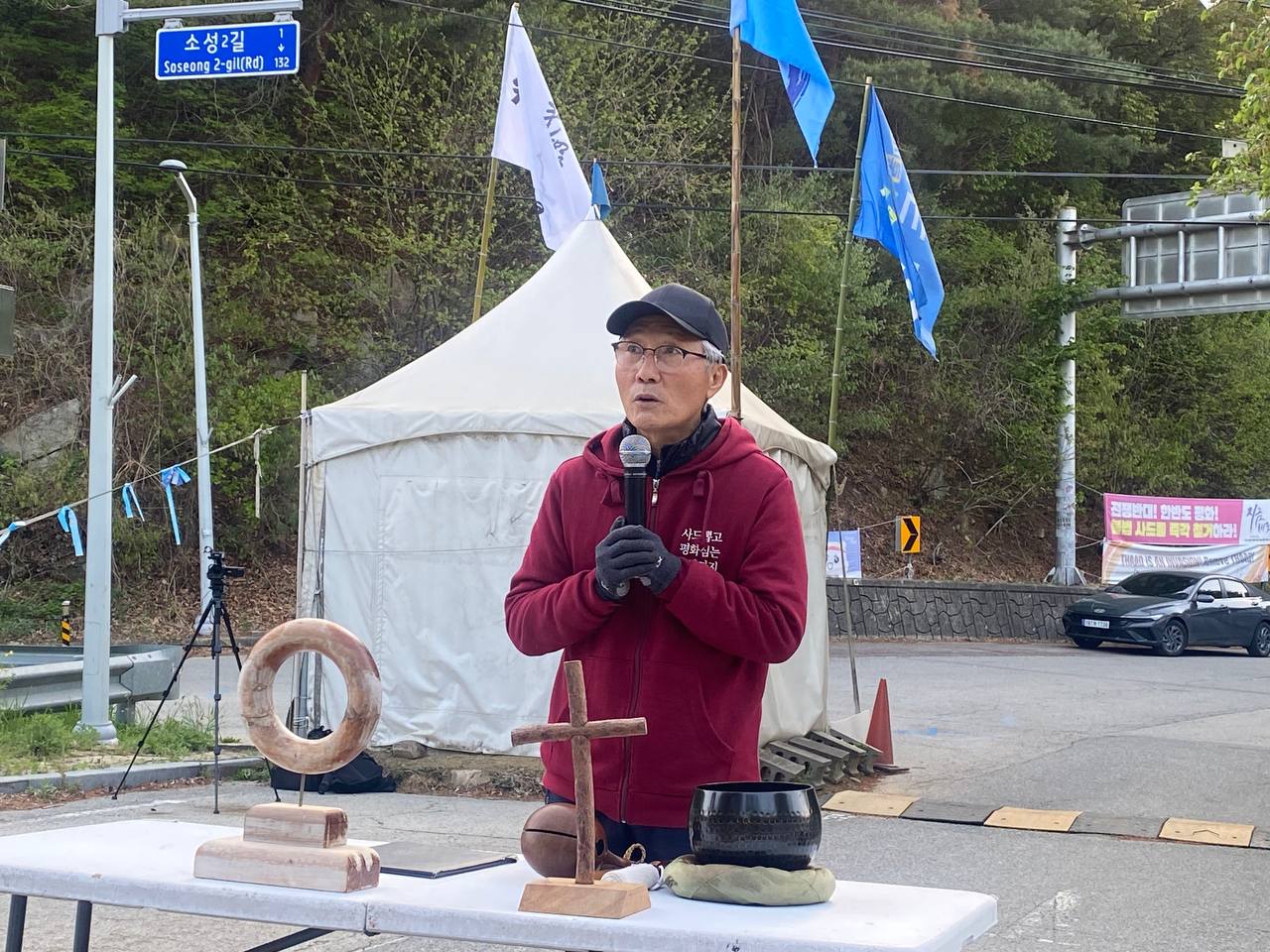 오전 7시 25분: 사드반대 김천시민대책위원회 박석민 고문은 민족 운동가이자 순교자였던 주기철 목사의 이야기를 전하며 "우리 역사에는 노동자, 종교인, 농민, 민중이 진행해온 빛나는 투쟁들이 많다"고 말합니다. "분단과 전쟁 위기 속에서 살고 있는 우리가 가장 강고한 평화운동을 벌여야 하지만, 어려운 것이 사실이다. 그럼에도 그 현실을 바꾸려는 최전선의 투쟁이 바로 사드 투쟁이다. 우리가 한발씩 앞으로 나아가서 역사를 바꾸자"고 강조합니다.