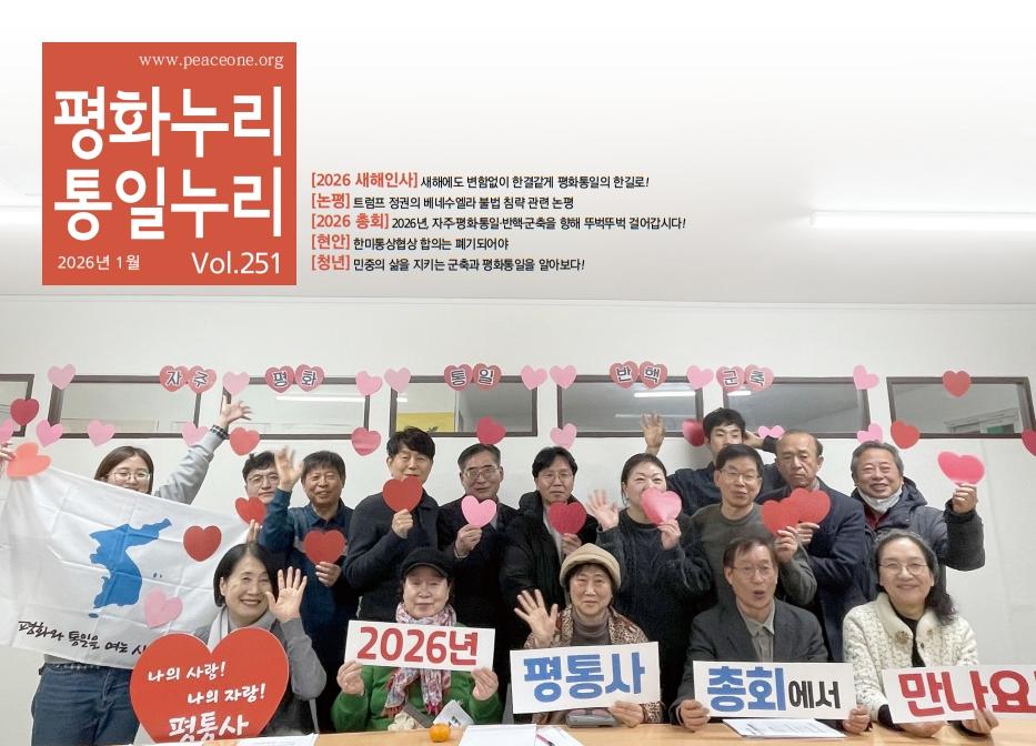 - 온라인으로 보기 [2026 새해인사] 새해에도 변함없이 한결같게 평화 통일의 한길로! [논평] 트럼프 정권의 베네수엘라 불법 침략 관련 평통사 논평 [2026 총회] 2026년, 자주·평화·통일·반핵·군축을 향해 뚜벅뚜벅 걸어갑시다! [현안] 한국경제의 공동화와 외환위기를 부르는 한미통상협상 합의는 폐기되어야 한다 [지역소식] 광주/목포/나주/순천/해남/마창진/논산/대전/보령/전주/부산/부천/서울/인천/성남용인/익산 [청년소식] -2025 청년평화아카데미_민중의 삶을 지키는 군축과 평화통일을 알아보다! -찾아가는 청소년 아카데미_김제에서도 청소년들이 만든 한반도 평화통일 지도를 들다! -전국 청년 모임 활동 소식 [회비와 후원금] 감사합니다 [결산보고] 2025년 12월