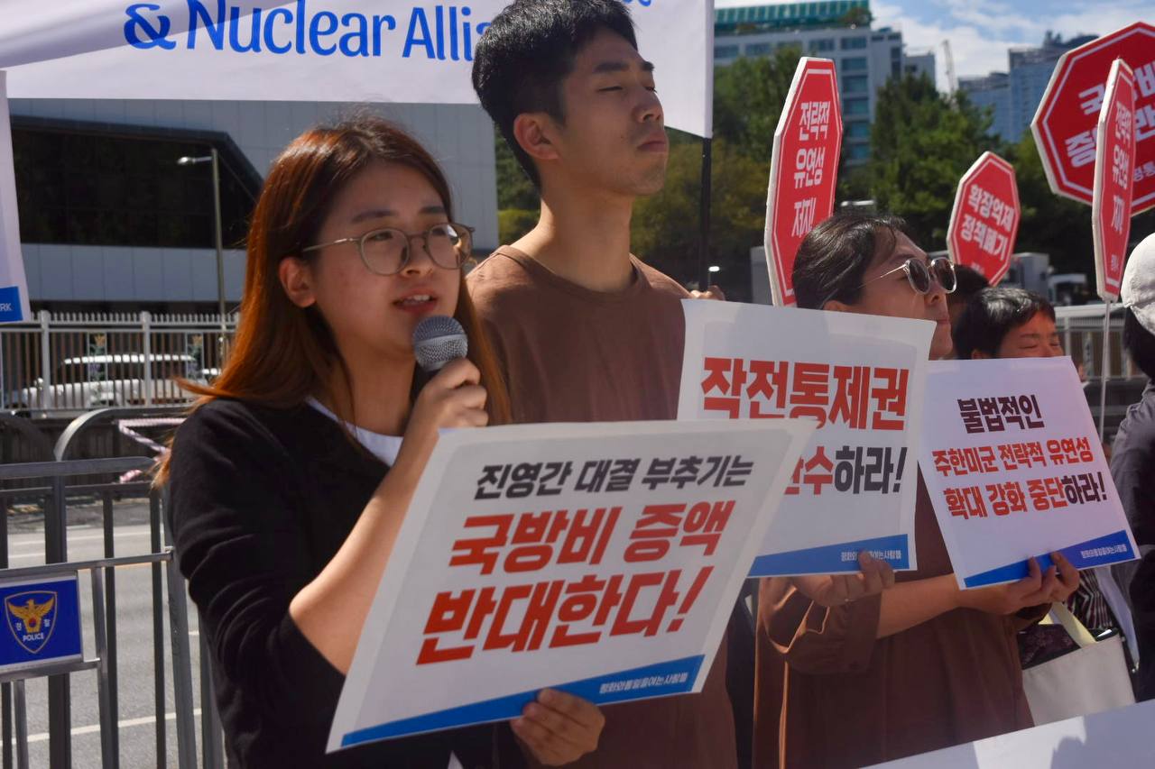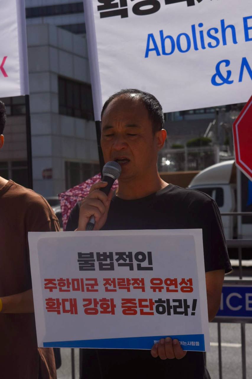 두번째 발언으로 평통사 청년활동가는 “미국은 한국에 주한미군 전략적 유연성을 강압하는 한편, 한국의 국방비 증액과 군비증강을 요구하고 있”다며