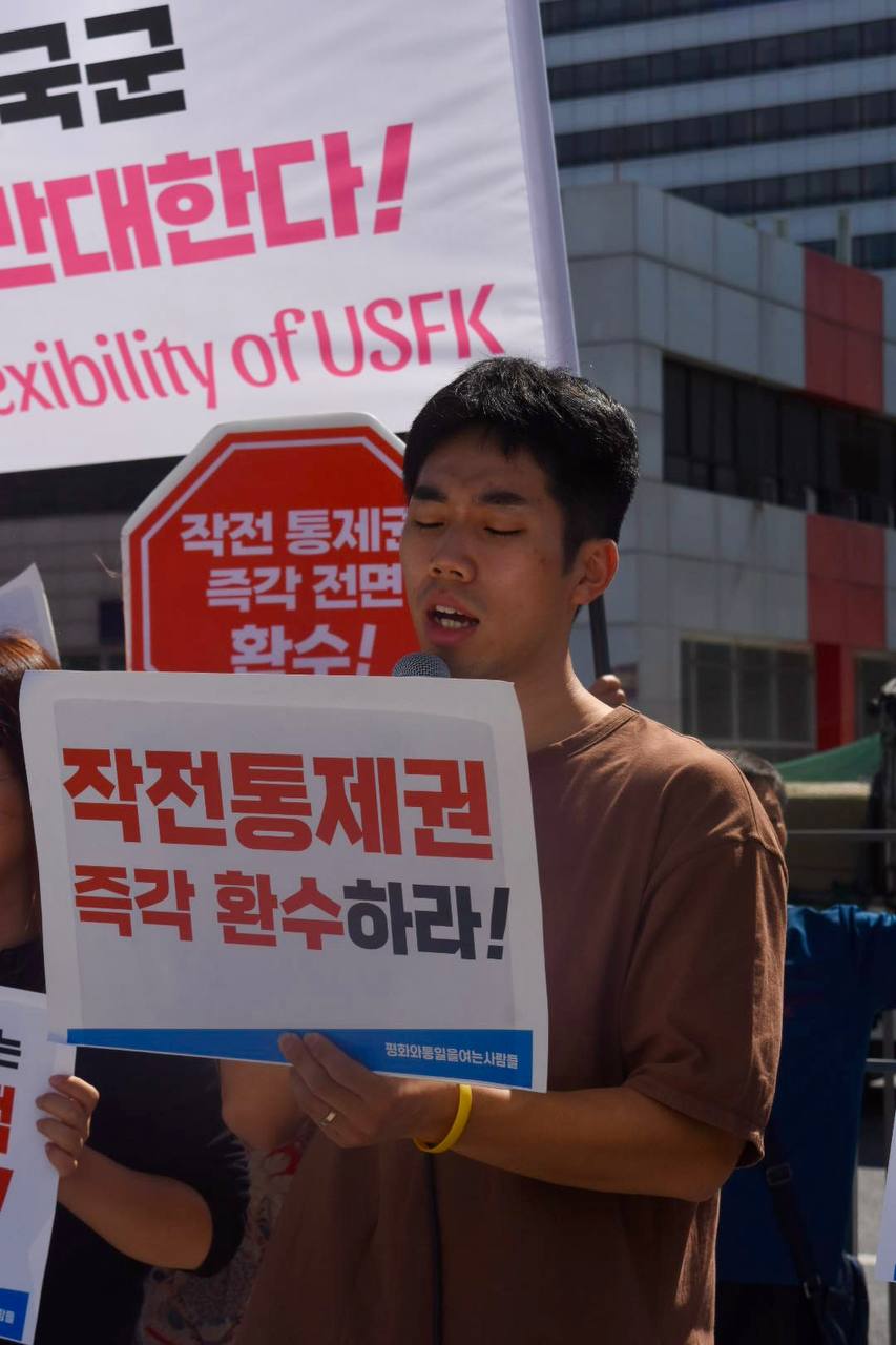 청년활동가는 '작전통제권 즉각 환수하라!는 내용으로 발언하고 있다.