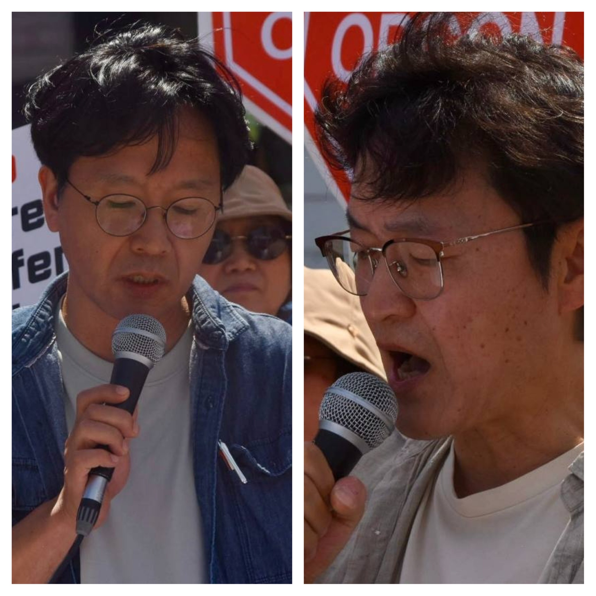 부산평통사 손기종 대표와 평통사 유정섭 팀장이 기자회견문을 낭독하고 있다.