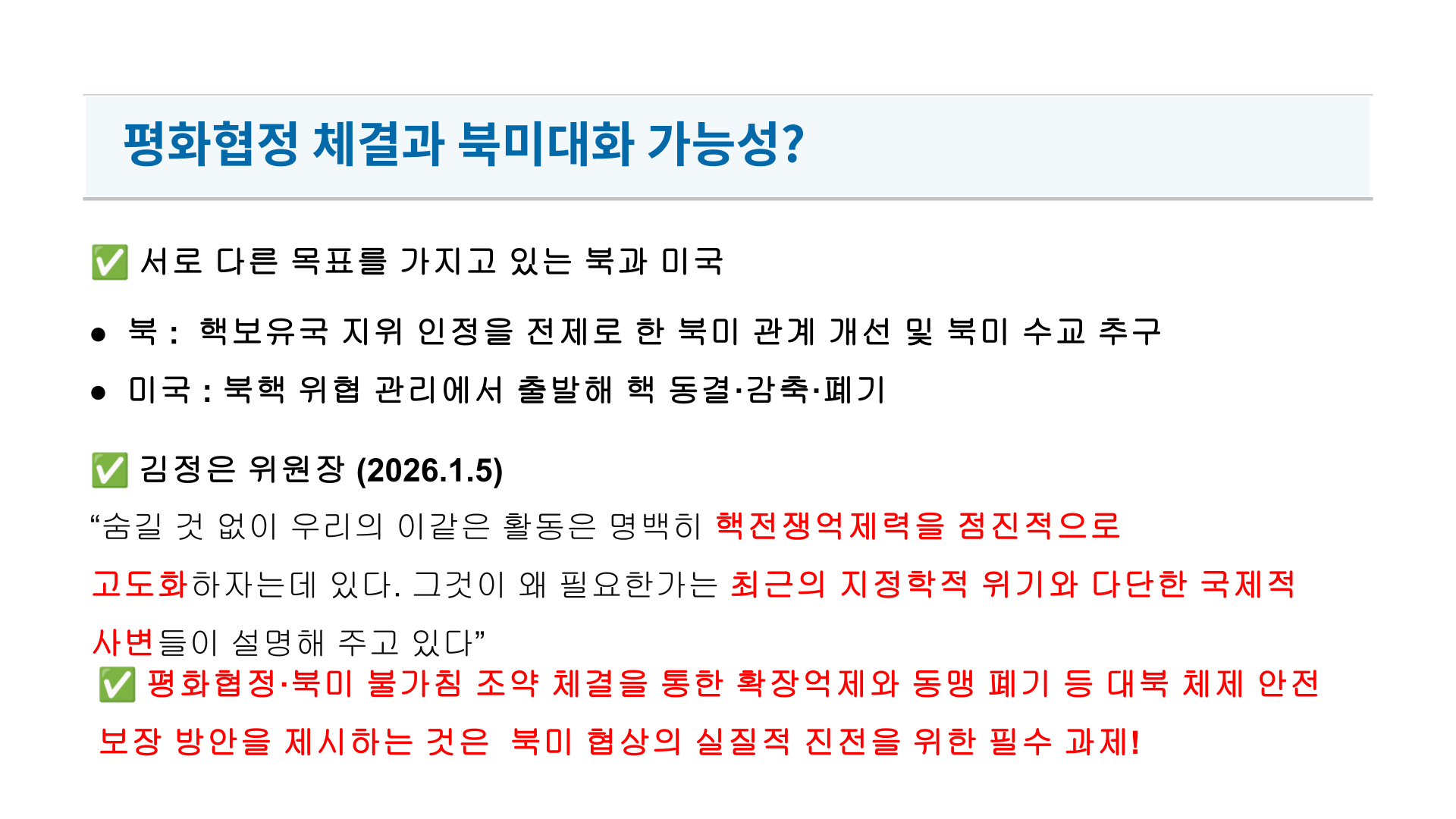 연초부터 세계 곳곳의 분쟁이 확산되고 있습니다. 특히 미 트럼프 정권은 베네수엘라에 대한 불법적 침략과 내정간섭을 자행하더니 그린란드, 이란, 멕시코 등에 대한 무력사용 위협을 하고 있습니다. 대만문제로 중일 갈등도 심화되고 있습니다. 남북 관계 전망도 어둡습니다.