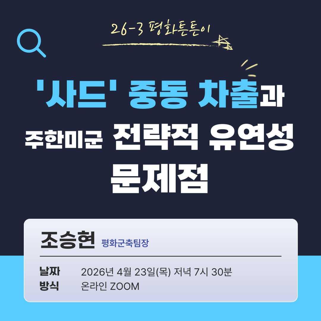 26-3 평화튼튼이 교육에서는 주한미군 사드 체계의 중동차출이 의미하는 바와 주한미군 전략적 유연성의 문제점을 짚어보고자 합니다. 회원 여러분들의 많은 참여를 부탁드립니다.
