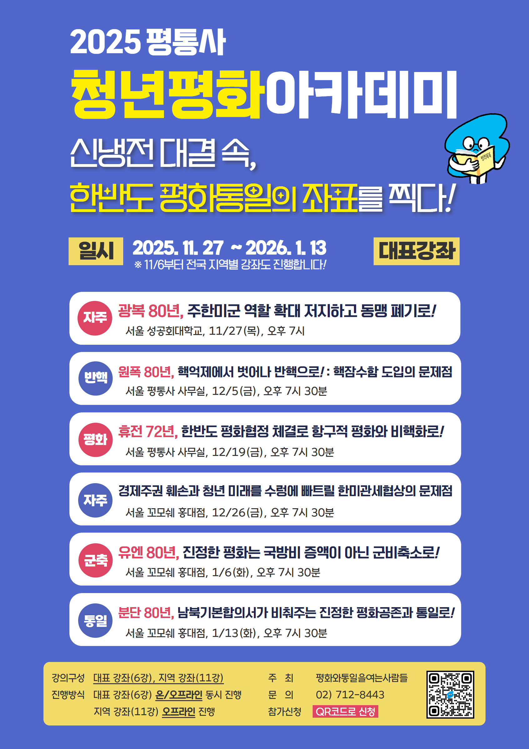 급변하는 국제 질서 속, 신냉전 대결이라는 거친 파고 앞에서 한반도의 평화와 통일은 길을 어둡기만 합니다. 올해 광복 80년, 분단 80년, 원폭 80년을 맞는 역사적인 전환점에서 한반도 평화통일의 방향을 제시하는 청년평화아카데미를 진행합니다.
