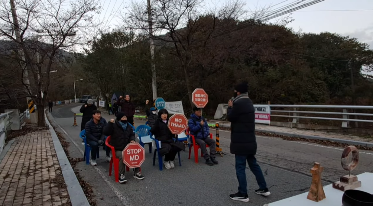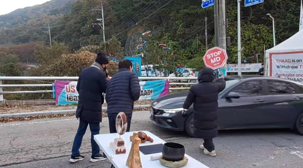 오전 7시: 불법 사드 공사를 위한 차량과 미군 차량이 지나가자 항의하는 구호를 외칩니다. “사드는 침략이다! 사드 부역 하지 마라! 불법 사드 공사 중단하라! 사드 뽑고 평화 심자!”