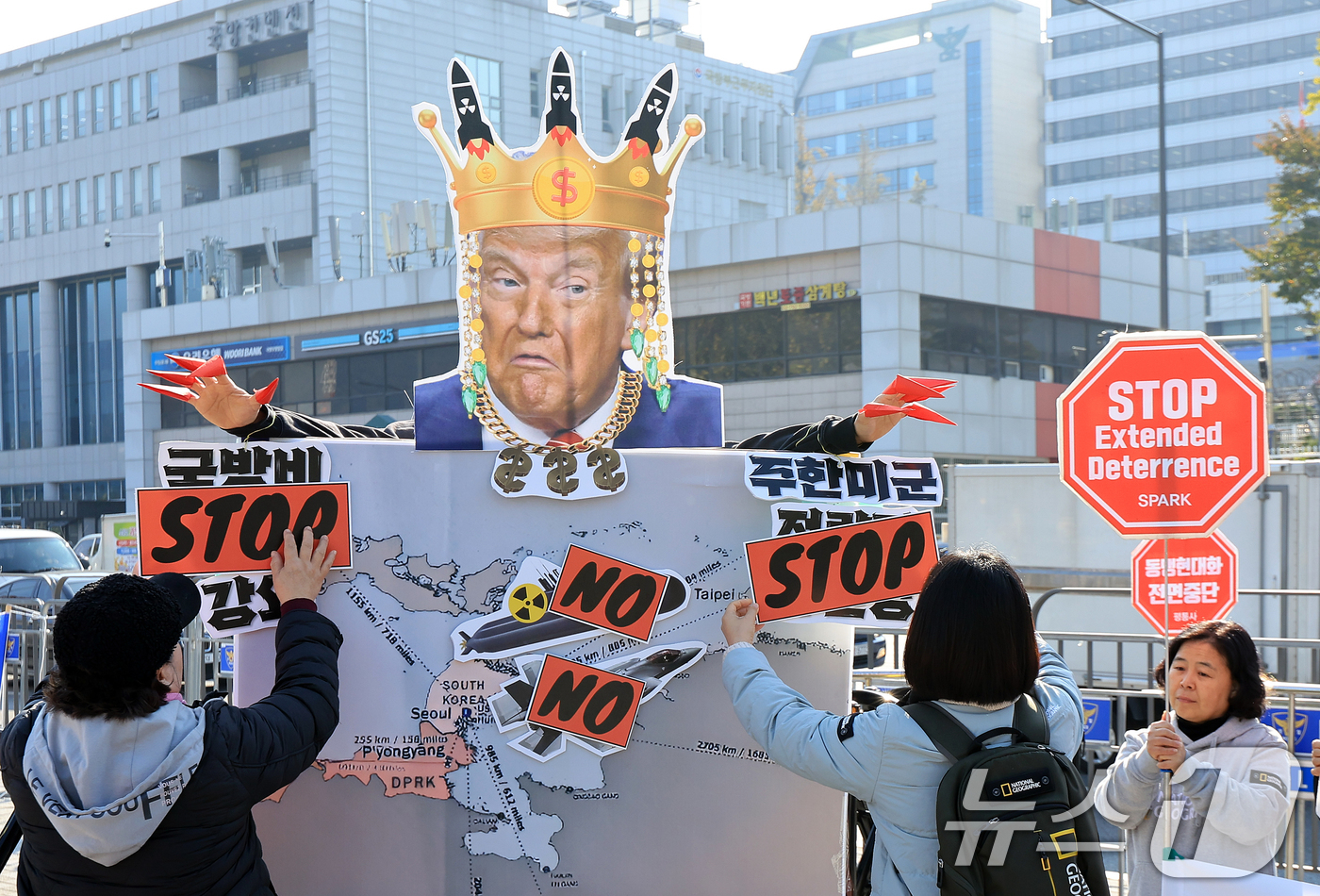 이날 기지회견 말미에는 트럼프 정권의 군사·경제적 압박에 반대하는 상징 퍼포먼스를 진행했습니다. 참가자들은 ‘NO’ 스티커를 붙이는 퍼포먼스로 주한미군 전략적 유연성 확대와 국방비 증액 강압에 대한 반대 의사를 표명했습니다.