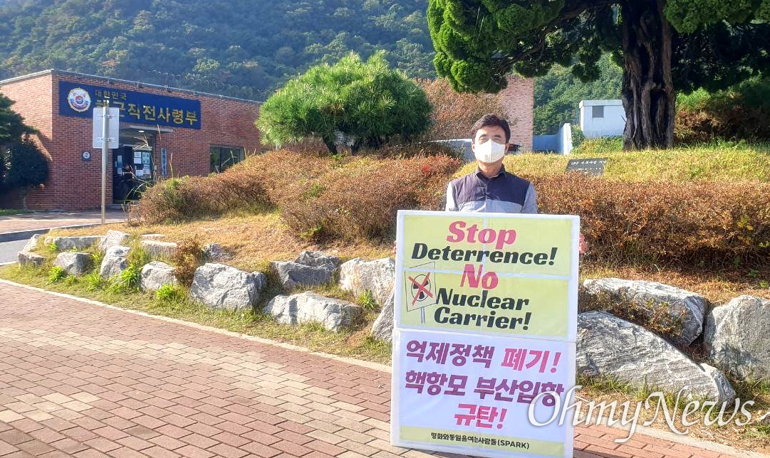 부산평통사 회원들이 미국 핵항모 전단 입항을 규탄하는 1인시위를 진행했다(사진출처: 오마이뉴스)