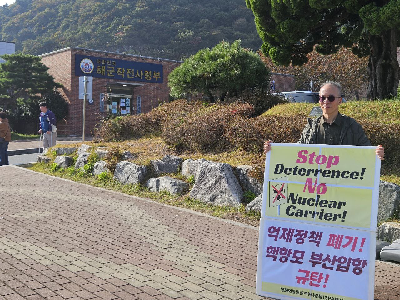이 같은 취지를 담아 핵항모가 출항하던 11월 9일, 백운포 주한미해군사령부 앞에서 신차범, 차성호 운영위원이 1인시위에 나섰습니다. 핵항모를 구경하러 나온 시민들이 피켓 구호에 관심을 보였습니다.