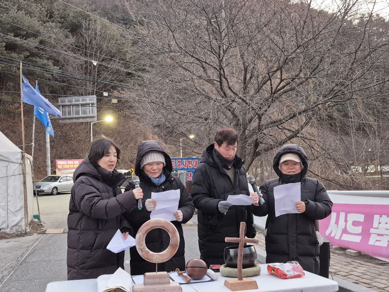 오전 7시 40분: 발언 중에 공사차량이 지나가자 참가자들은 자리에서 일어나 구호를 외칩니다. 많은 분들이 참여하는 2026년 첫번째 평화행동을 힘차게 마치고, 올해 더 많이, 더 강하게 투쟁하자고 마음을 모으며 이날 평화행동을 마무리합니다.