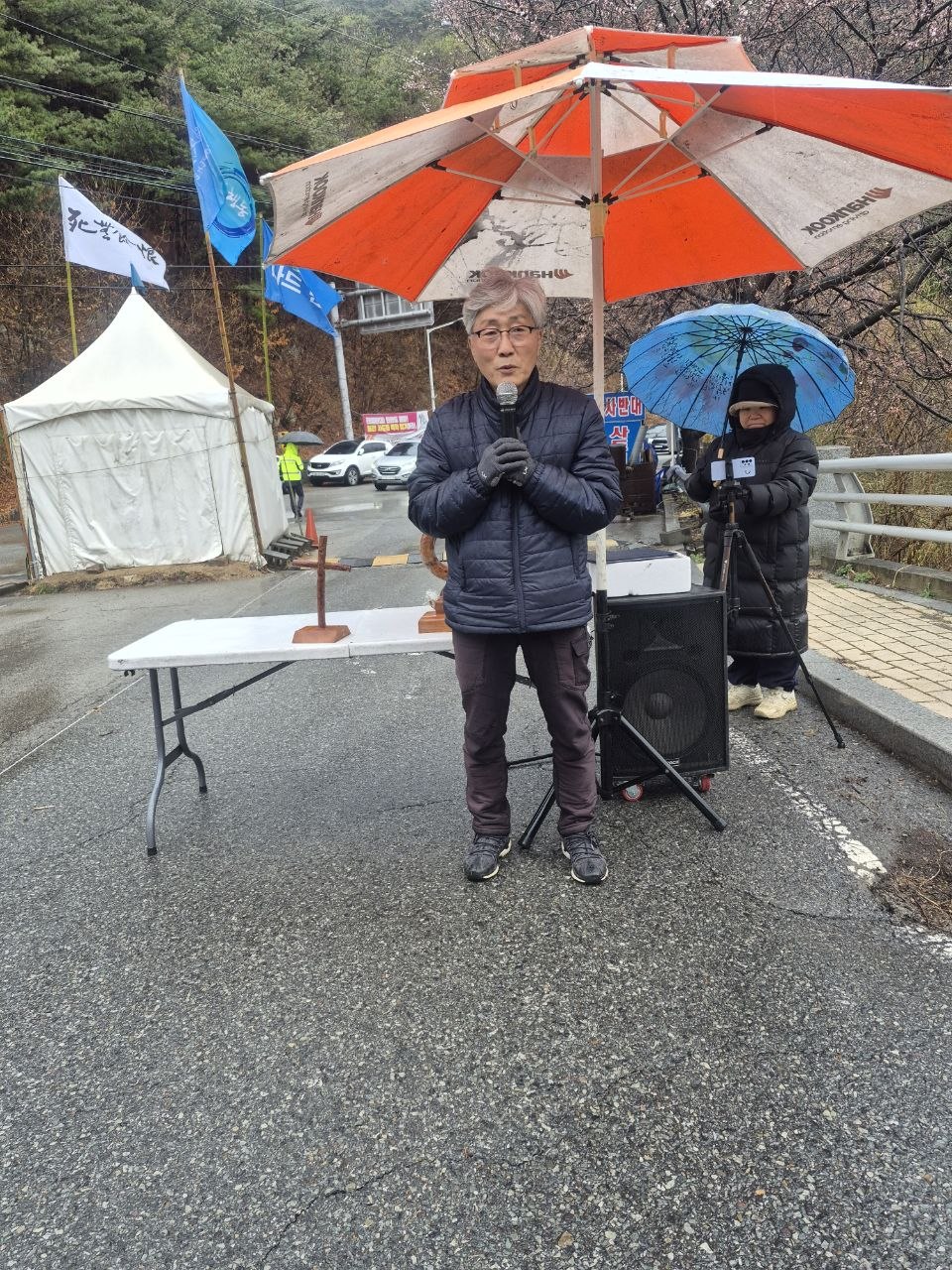 오전 7시 15분: 사드반대김천시민대책위원회 박석민 고문은 "100년 전의 민족해방운동이 우리의 자주와 평화운동으로 이어지고 있다"고 하면서 사드 투쟁의 정당성을 힘주어 이야기합니다. 발언 중에 공사 인부와 장비가 들어가자 자리에서 일어나 힘차게 구호를 외칩니다.