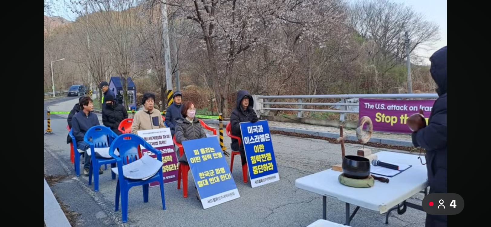 오전 6시 40분: 오늘도 진밭교에서 불법 사드 공사 중단과 사드 철거를 요구하는 1,034번째 평화행동을 시작합니다. 오늘 평화행동에는 대구 평통사 회원들이 함께 합니다. 다같이 임을 위한 행진곡을 부르고 원불교 평화법회를 시작합니다.