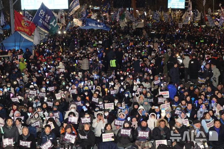 12/3 계엄 1년을 맞아 내란/외환 청산과 종식, 사회대개혁 시민대행진에 참여한 사람들이 응원봉을 흔들고 있다.(사진출처 : 뉴시스)
