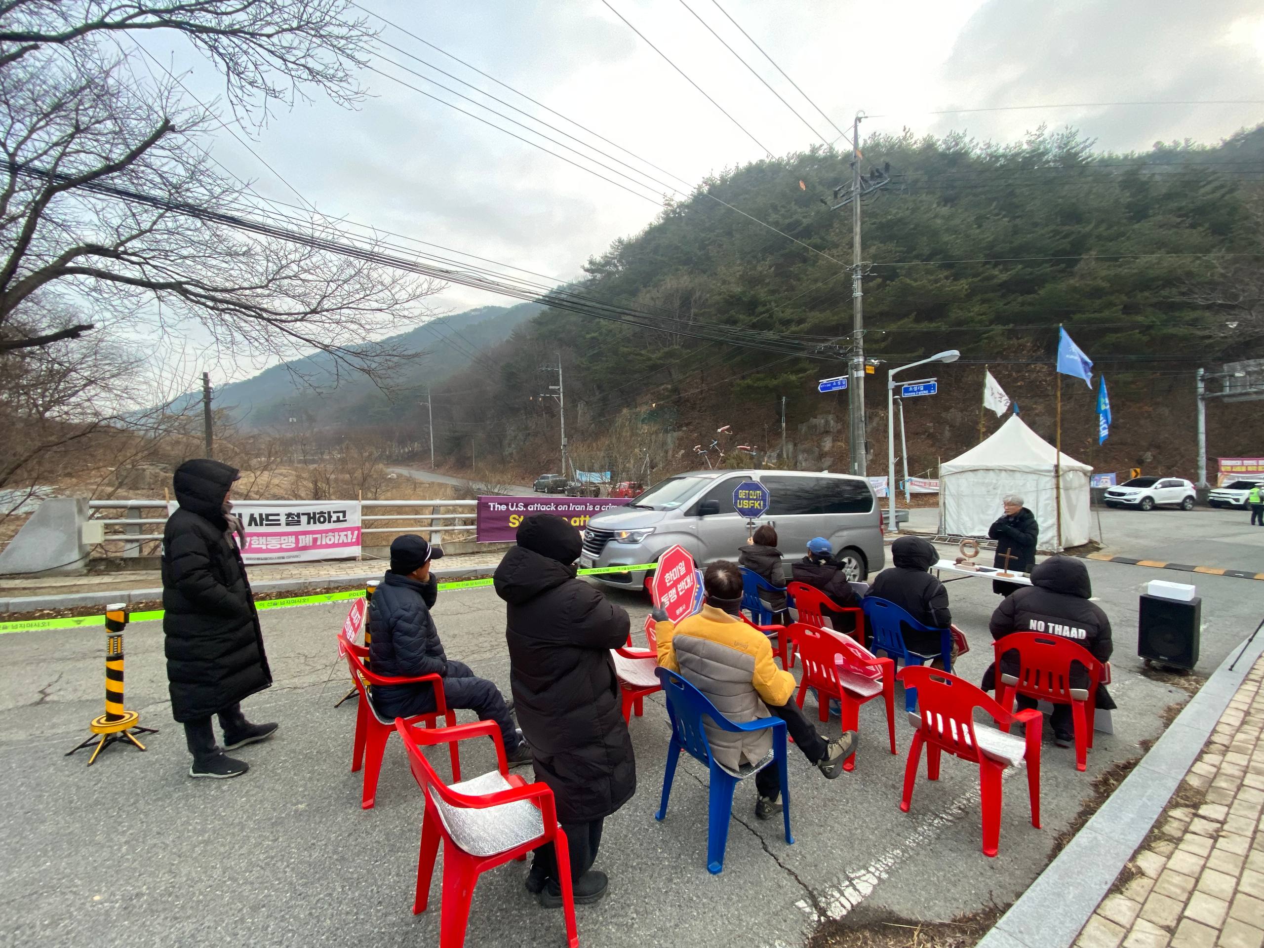 오전 7시 30분: 불법사드공사차량이 진입하자 평화행동 참가자들은 피켓을 들어 “사드는 침략이다!”, “불법사드 공사 중단하라!” 구호를 외칩니다.