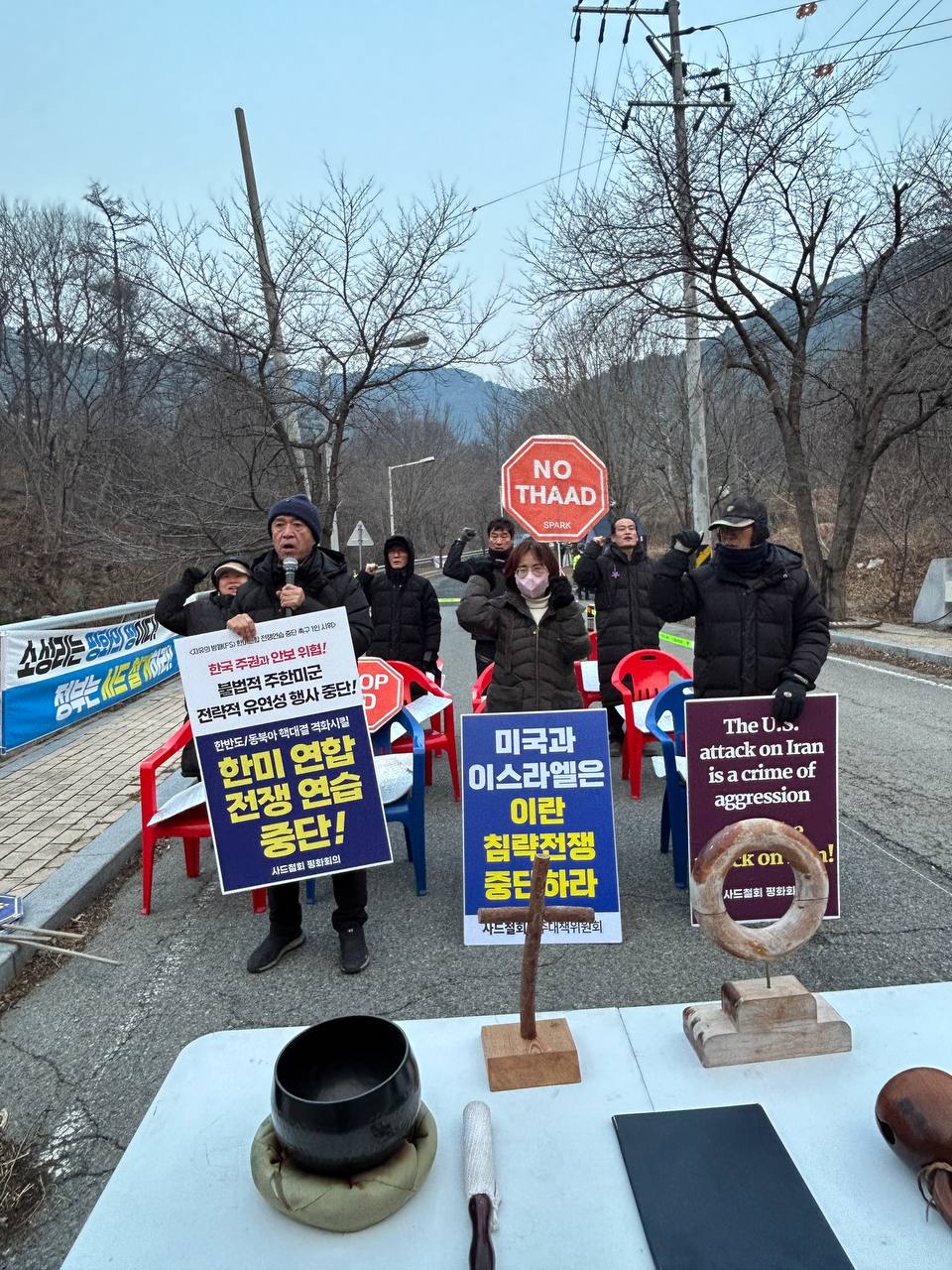 오전 6시 50분: 오늘도 진밭교에서 불법 사드 공사 중단과 사드 철거를 요구하는 1,019번째 평화행동을 시작합니다. 오늘 평화행동에는 인천평통사가 함께 합니다.