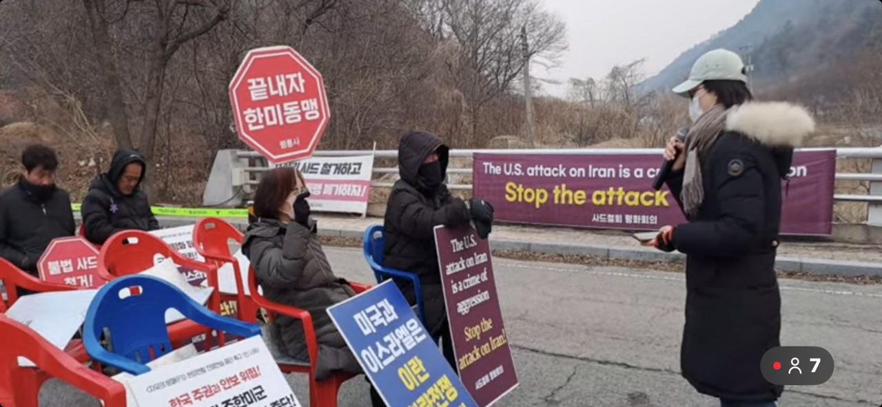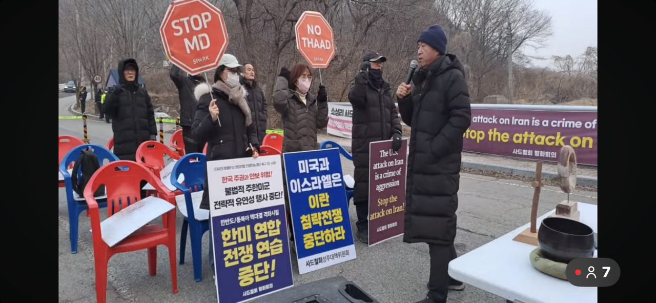 오전 7시 00분: 첫번째 순서로 원불교 평화법회를 박형선 교무가 진행합니다. 박형선 교무는 “사드가 한반도를 나갔지만, 이란의 불법적 전쟁에 인명을 살상하려 간 것에 대해 마음이 아프고, 세계 평화를 해치는 사드는 미국으로 돌려 보내자”고 했습니다.