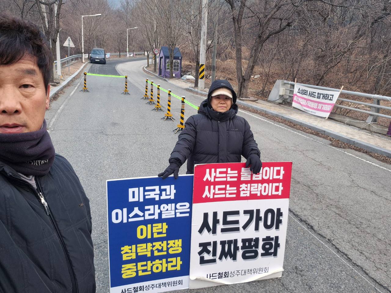 오전 7시 40분: 평화행동을 마무리하며 사드가 없는데도 불법 공사를 위해 기지로 들어가는 차량을 향해 구호를 외칩니다. "사드부역 중단하라!", "불법공사 중단하라!"