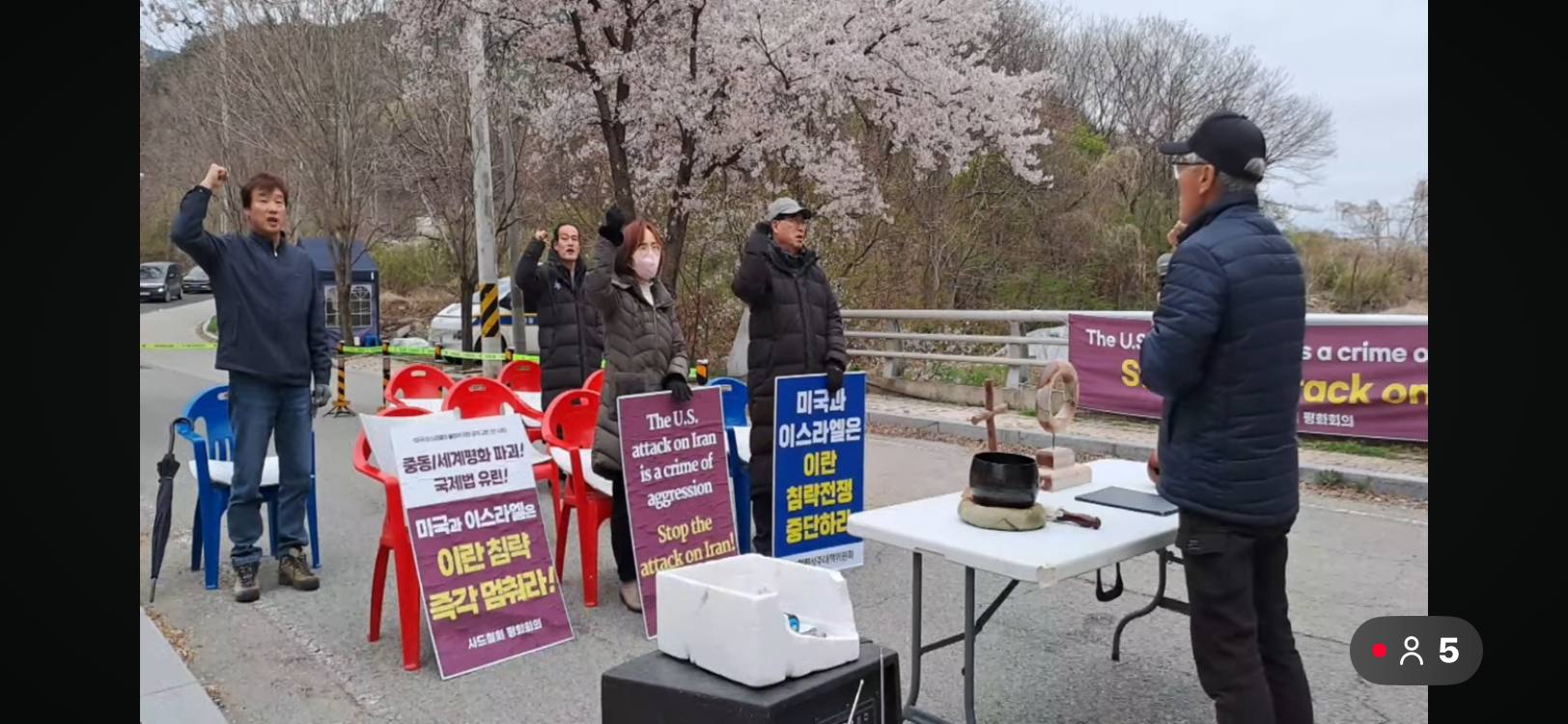오전 6시 40분: 진밭교에서 불법 사드 공사 중단과 사드 철거를 요구하는 1,039번째 평화행동을 시작합니다. 다같이 임을 위한 행진곡을 부르고 원불교 평화법회를 시작합니다.