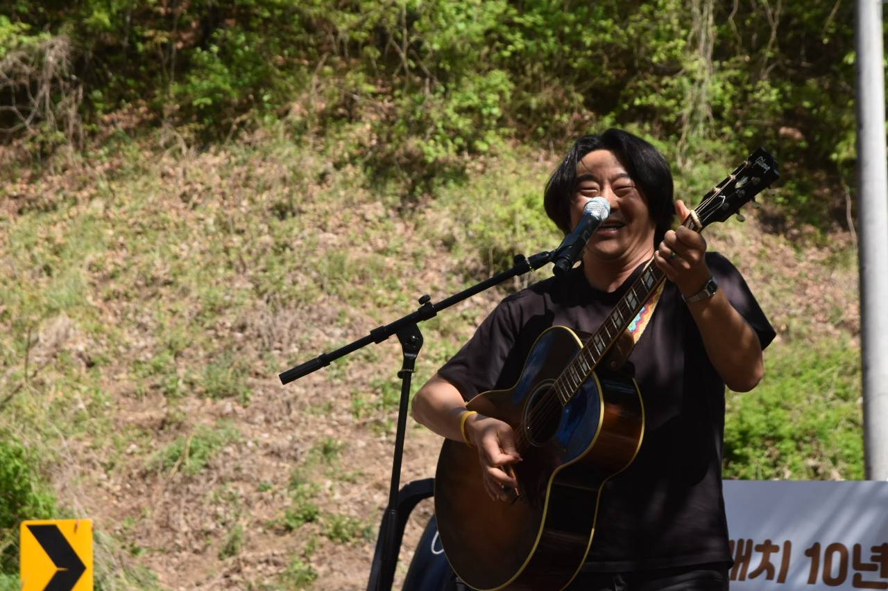 장연호 가수의 노래 공연이 이어졌습니다. '평화가 길이다 다른 길은 없다!' 소성리 주민들과 연대자들에게 힘을 주는 따뜻한 가삿말을 참가자들은 피켓을 흔들며 노래를 따라 불렀습니다.