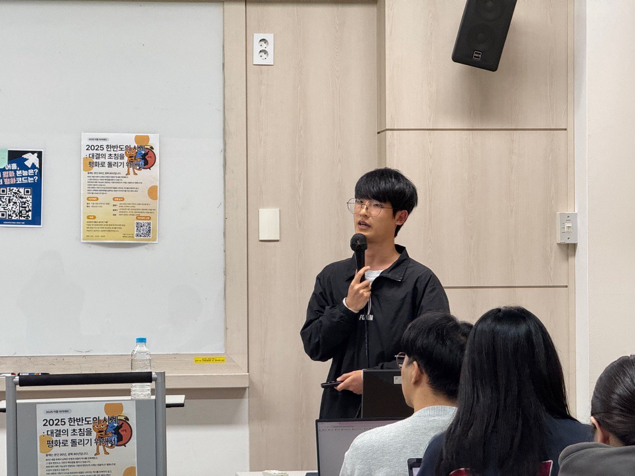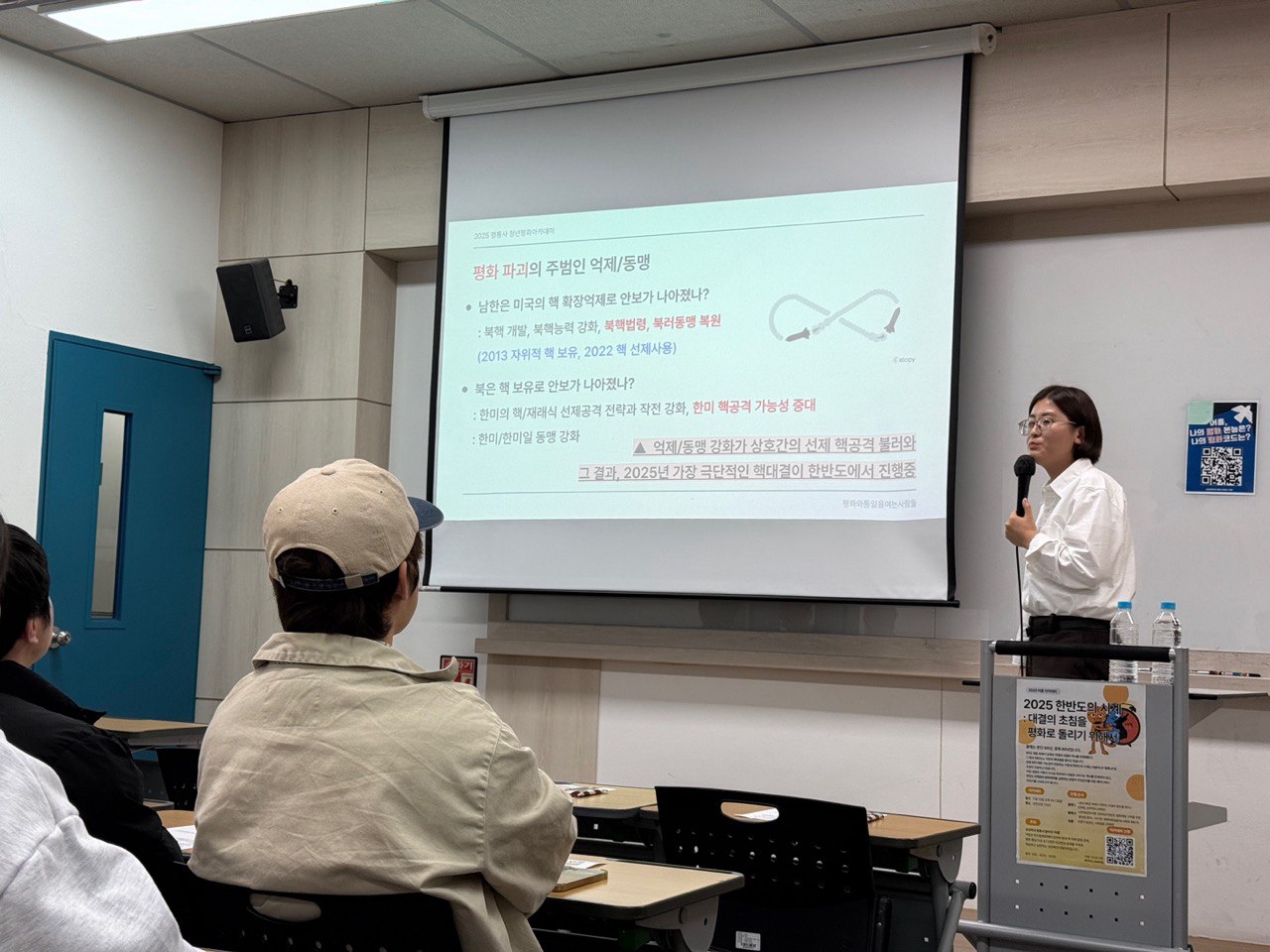 11월 13일(목), 성공회대학교에서 평통사 동아리인 ‘어흥’의 주최로 “2025 한반도의 시계: 대결의 초침을 평화로 돌리기 위해서”를 주제로 청년평화아카데미를 진행했습니다. 이번 아카데미는 분단 80년을 맞아 남북 군사대결의 원인으로 억제와 동맹의 문제점을 짚고, 북미회담 재개와 한반도 평화체제 수립을 위해선 어떤 방안이 있는지 알아가는 시간으로 구성했습니다.