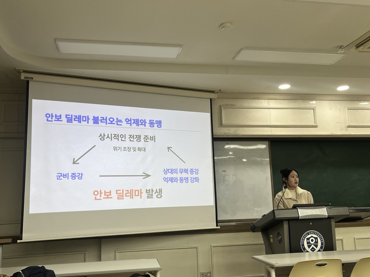 이어 청년회원은 “억제와 동맹이 적과의 상시적인 전쟁 준비 속에서 위기를 조장하고, 확대시킨다. 그런 명분에서 끊임없는 군비증강의 길을 걷게 된다. 그러나 이는 상대의 무력증강을 불러와 안보딜레마의 블랙홀에 빠진다.”고 지적했습니다. 2023년 캠프데이비드 선언을 통해 한미일 동맹을 구축해나가고, 북중에 대한 확장억제를 강화한 것이 도리어 북러 동맹 복원과 북중러의 결집 강화를 불러왔음을 사례를 들어 생동감 있게 전달했습니다. 청년회원은 억제와 동맹에 기댄 결과, 한반도가 선제공격을 핵무기로 하겠다며 위협하는 세계 유일무이한 지역이 되었음을 경고하며, 북도 핵보유로 인해 오히려 안보가 위태로워진 역설을 지적했습니다. 한편으로, 북핵에 미국의 핵으로 대응해야 한다며 소위 핵은 핵으로만 막을 수 있다는 신화의 문제점을 살펴보았습니다.