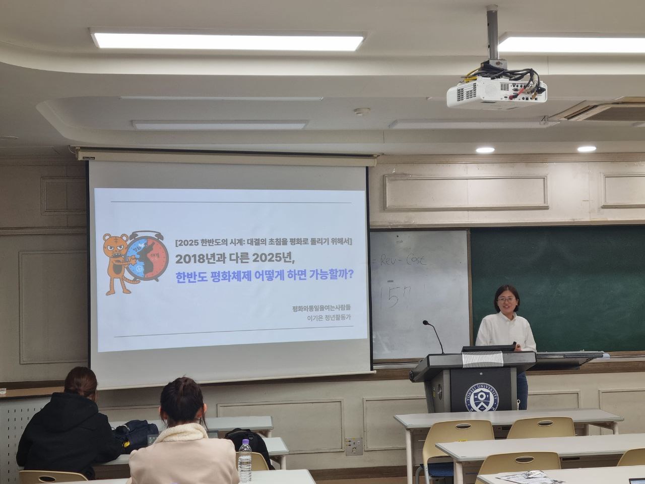 두 번째 발표로는 이기은 청년활동가가 ‘2018년과 다른 2025년, 한반도 평화체제 어떻게 하면 가능할까?’를 주제로 강의를 진행했습니다.
