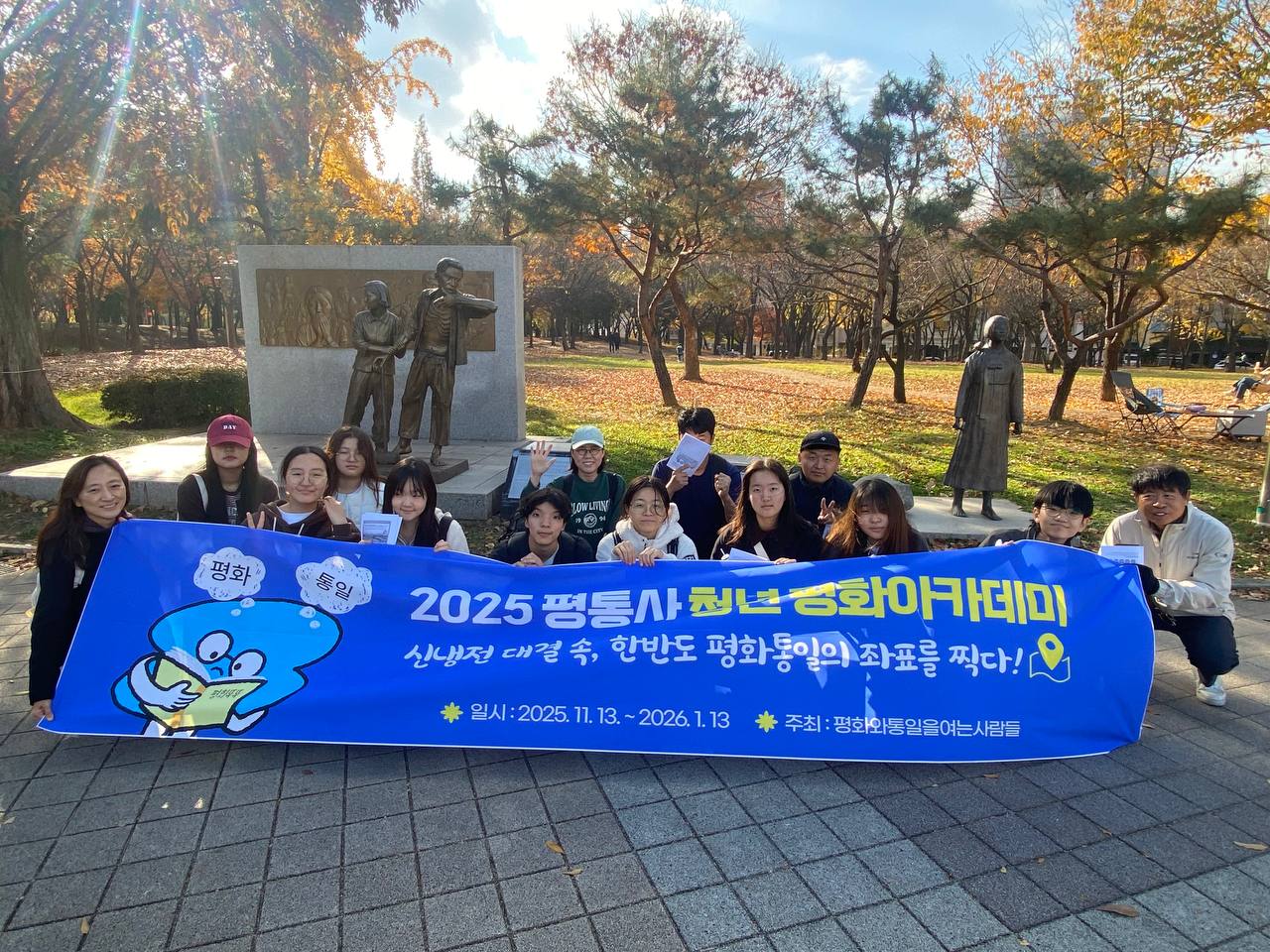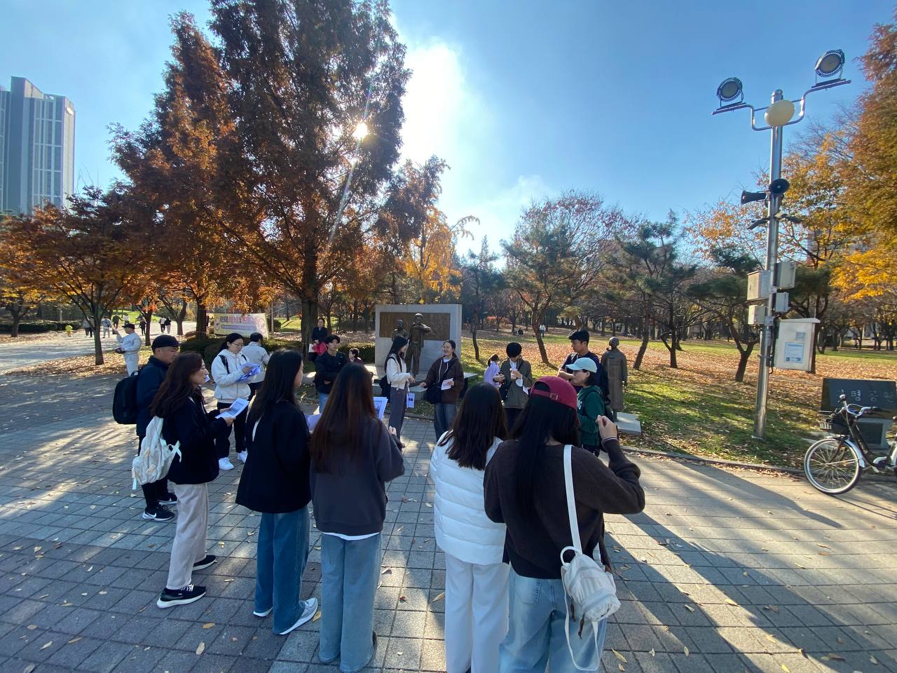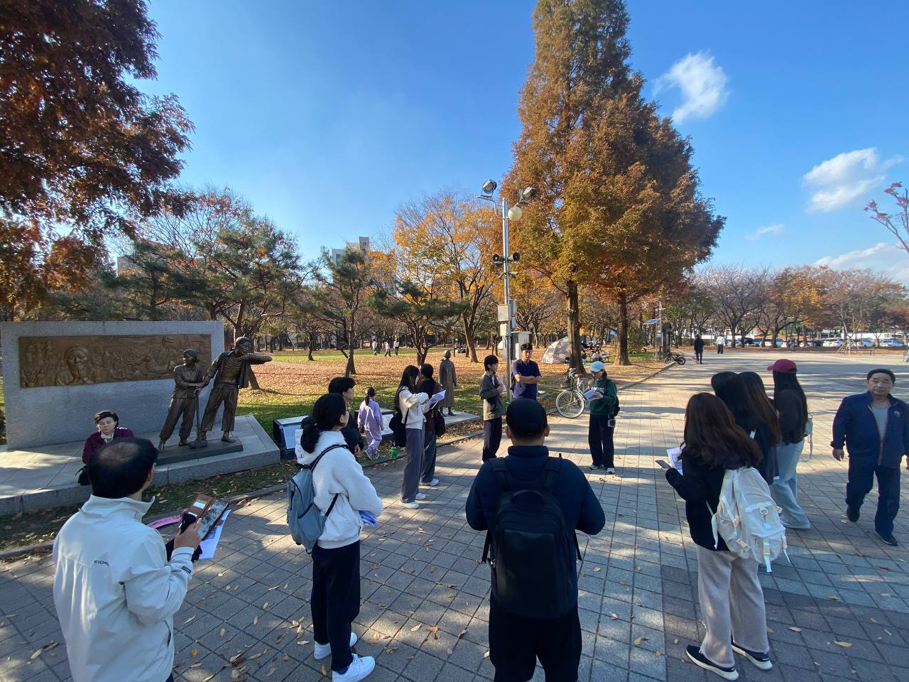 첫 번째 코스인 부평공원은 낙엽들이 무르익고 완연한 가을 분위기가 물씬 느껴졌습니다. 하지만 공원 내에 있는 ‘위안부’ 소녀상과 강제징용 노동자 상 앞에서 참가자들은 분단과 전쟁으로 인한 피해를 잊지않기 위해 노력하고자 하는 마음을 가져보았습니다. 여전히 한일관계를 지난 역사에 대한 사죄와 배상을 하지않은채 나아가고자 하는 이재명 정부의 행보에 대해서도 우려섞인 목소리를 나누었습니다. 또한 참가자들은 한국 원폭피해자들의 존재에 대해서도 다시 한번 되세기며 광복 80년이 지난 올해 아직도 우리에게 진정한 광복이 오지 않았음을 가슴 아파했습니다.