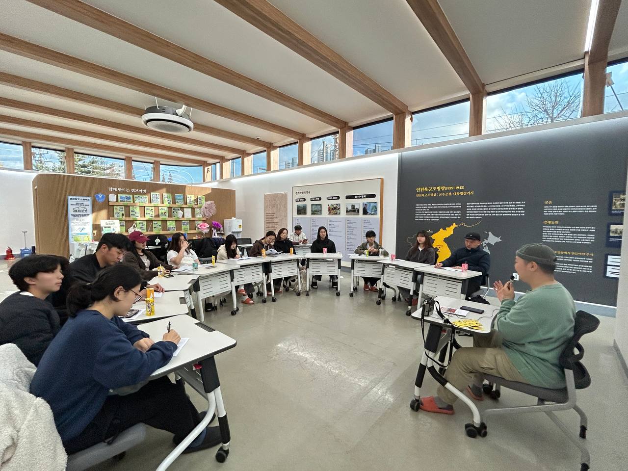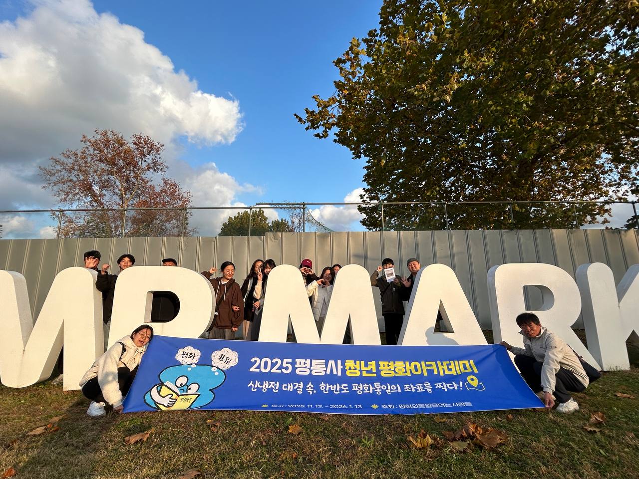인천 부평 캠프마켓 있던 부지 안에서 인천청년평화아카데미 참가자들이 단체사진을 찍고 있다