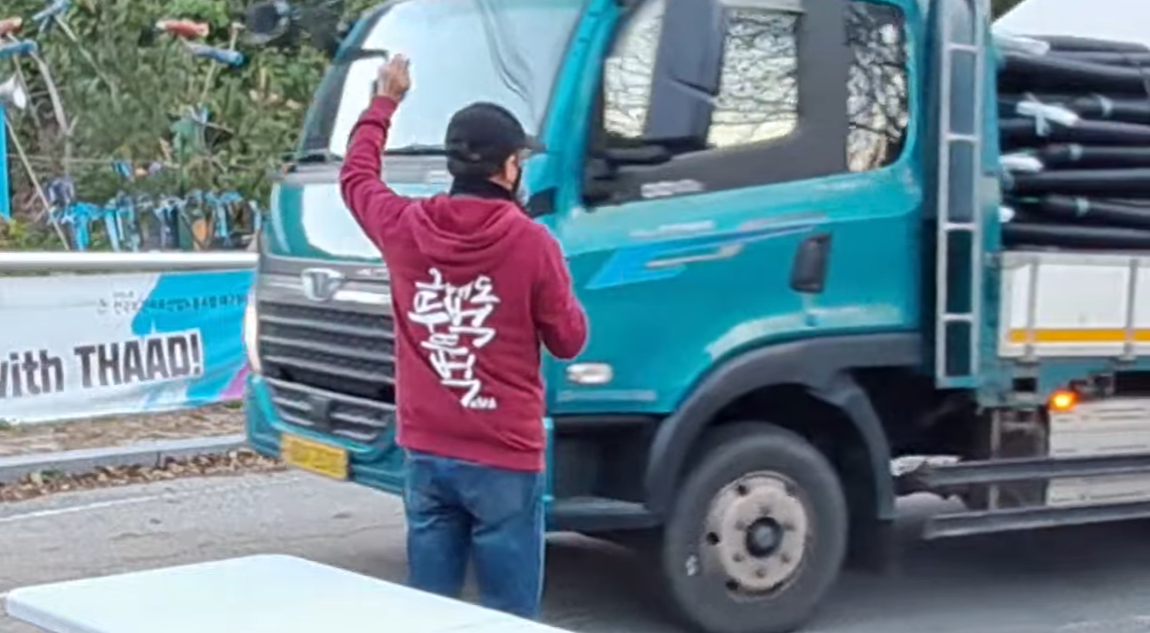 오전 7시 20분 : 불법 사드 공사를 위한 시멘트를 가득 싣고 들어가는 차량을 향해 항의하는 구호를 외칩니다. “사드는 침략이다! 사드 부역 하지 마라! 불법 사드 공사 중단하라! 사드 뽑고 평화 심자!”