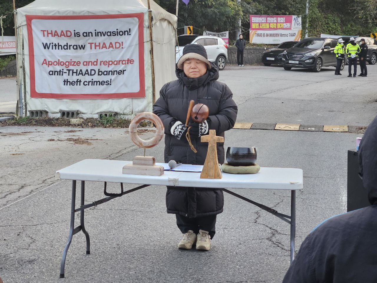 오전 6시 40분: 부쩍 추워진 날씨에 움츠러든 몸을 풀고 평화행동을 진행합니다. 평화행동을 시작하자마자 불법사드 공사차량이 들어가 참가자들은 힘차게 구호를 외칩니다.