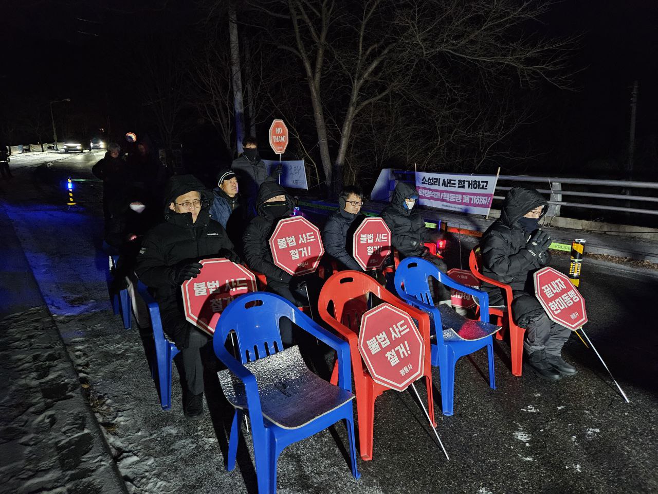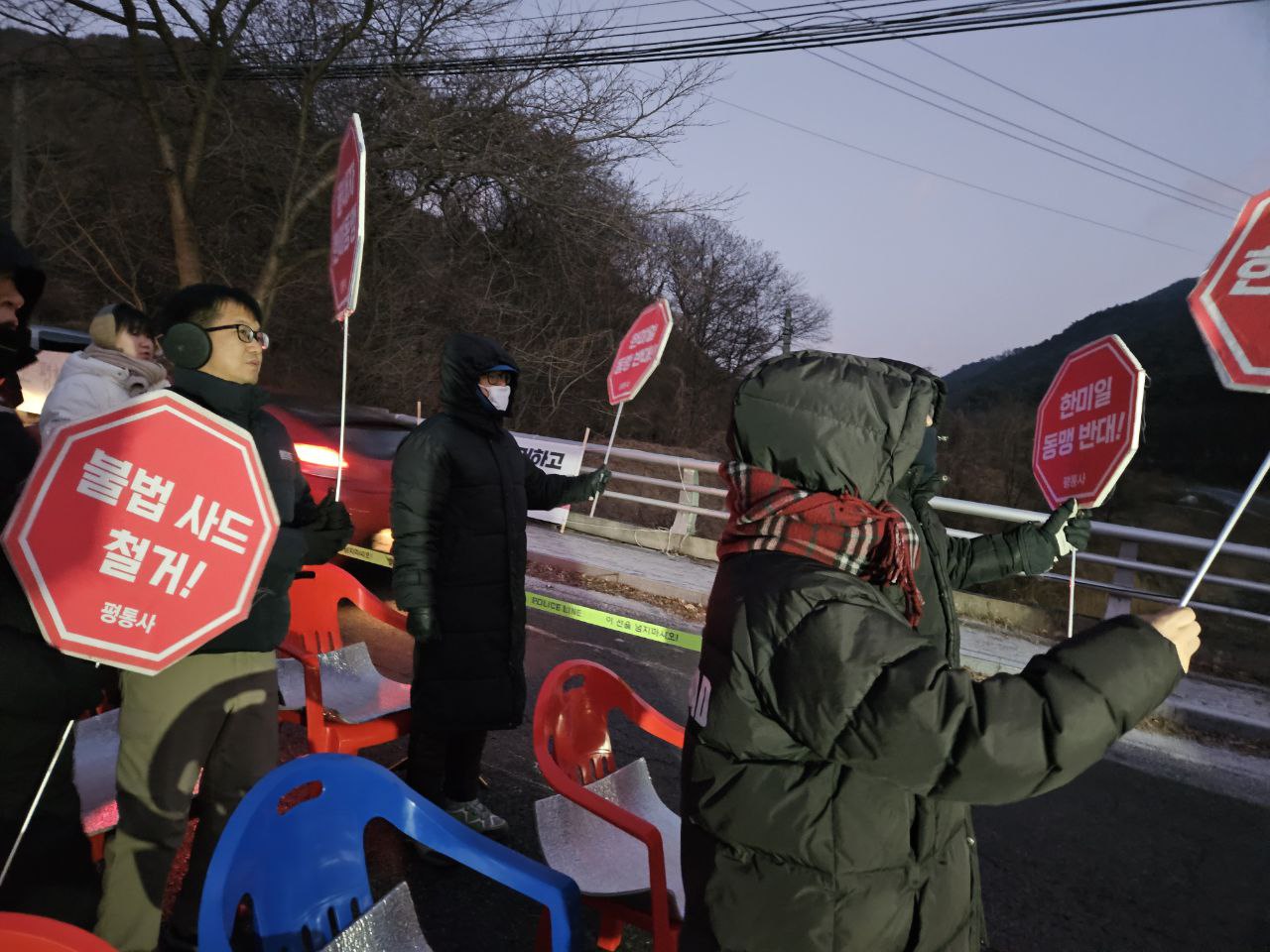 오전 6시 40분: 동이 트기 전 강한 바람이 부는 소성리 진밭교에서 오늘도 불법사드 철거를 외치는 주민과 연대자들이 모였습니다. 오늘은 부산평통사가 함께 합니다. 먼저 투쟁하신 분들을 기억하는 묵념을 하고 임을 위한 행진곡을 함께 부릅니다.