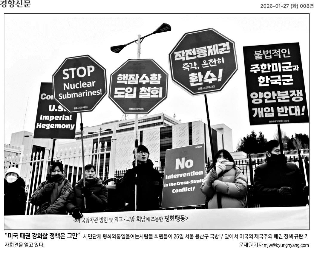[평화행동] 1/26 미 국방차관 방한 및 외교 국방 회담에 즈음한 평화행동