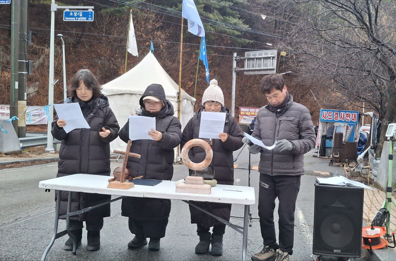오전 6시 50분: 다같이 움직이며 추위에 굳은 몸을 풉니다. 이어서 먼저 투쟁하신 분들을 기억하는 묵념을 하고 임을 위한 행진곡을 함께 부릅니다. 강현욱 교무와 원불교 평화법회를 진행합니다.