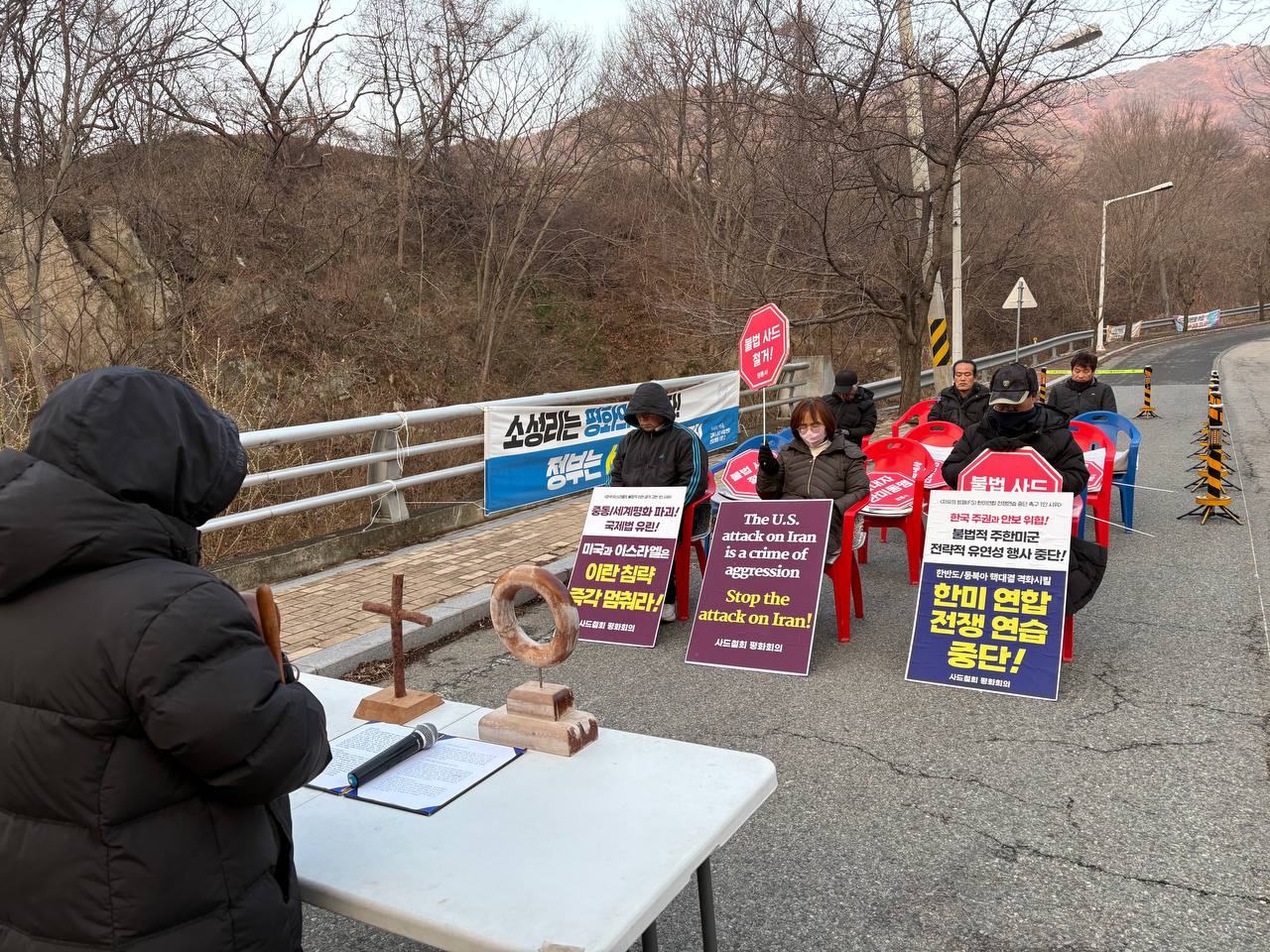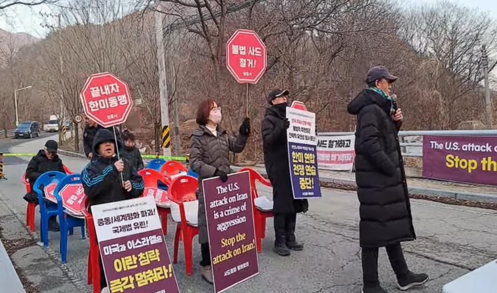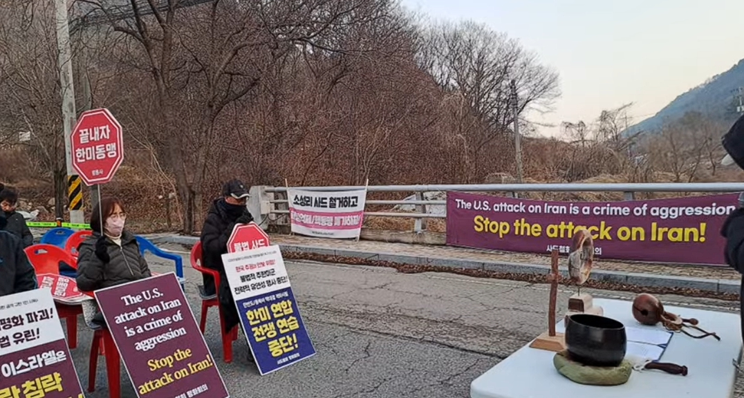 오전 6시 40분: 오늘도 진밭교에서 불법 사드 공사 중단과 사드 철거를 요구하는 1,024번째 평화행동을 시작합니다. 오늘 평화행동에는 대구평통사가 함께 합니다. 참가자들은 "전쟁을 끝내라!", "호르무즈 파병 하지마라!", "사드 뽑아내자!" 구호를 힘차게 외치며 평화행동을 시작했습니다.