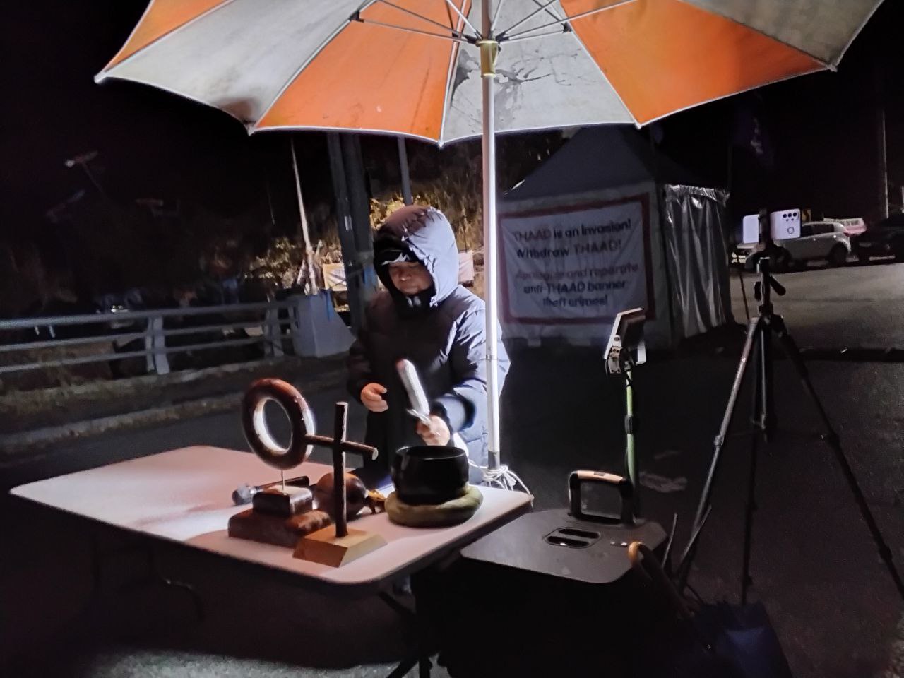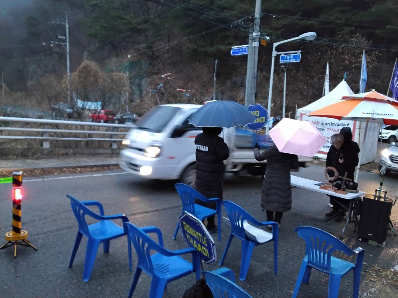 오전 6시 40분: 어둠이 깔린 소성리 진밭교에 비가 내립니다. 강추위에도 오늘도 어김 없이 소성리 아침 평화행동을 시작합니다. 오늘은 청년활동가가 연대합니다.