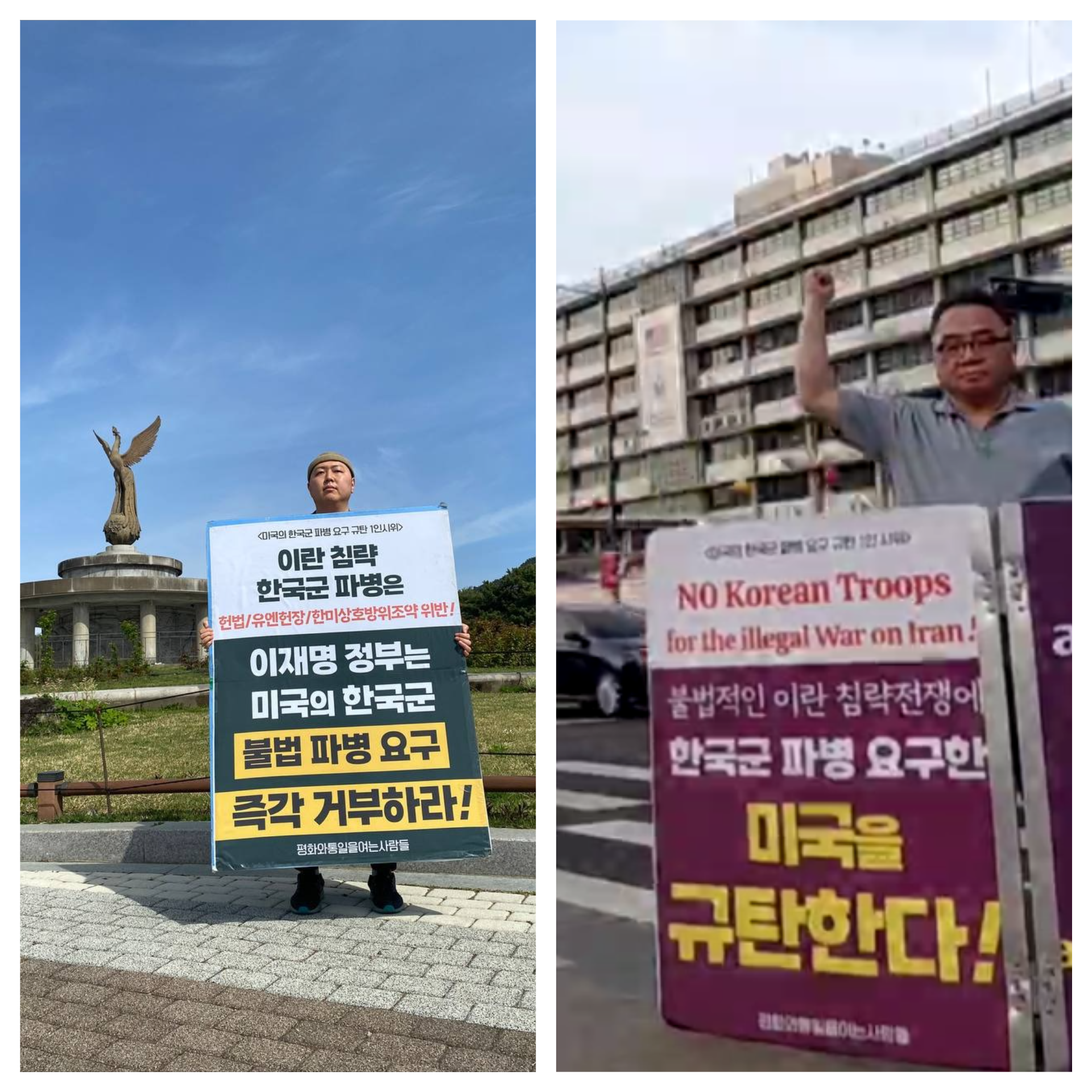 오늘도 전국 각지에서 이란 침략 중단과 한미연합연습 중단을 촉구하는 1인 시위를 진행했습니다. 서울 미대사관 앞으로 비롯해 광주, 대전, 무주, 부산, 성남, 인천, 창원 등에서 회원들이 참여했습니다.