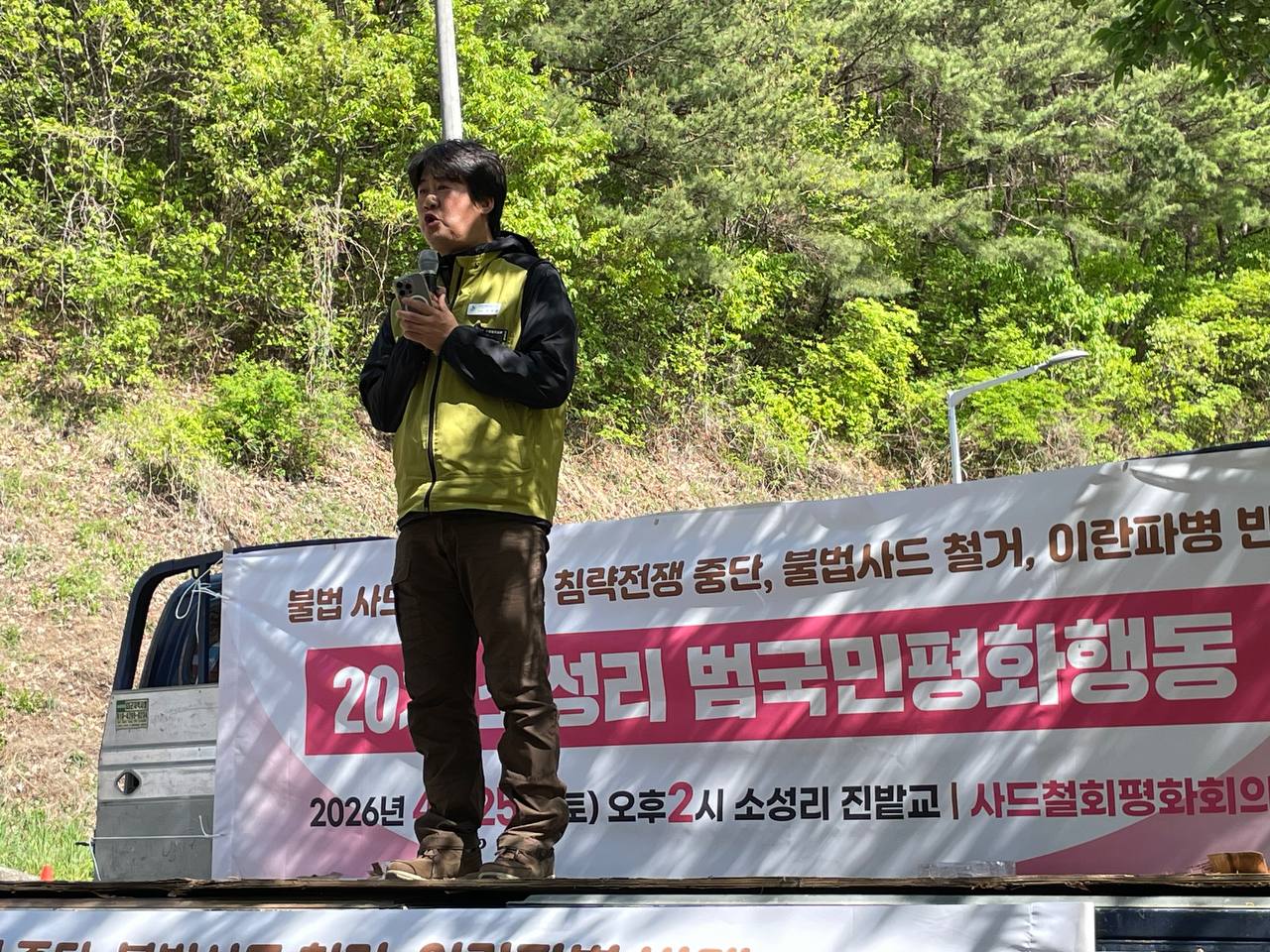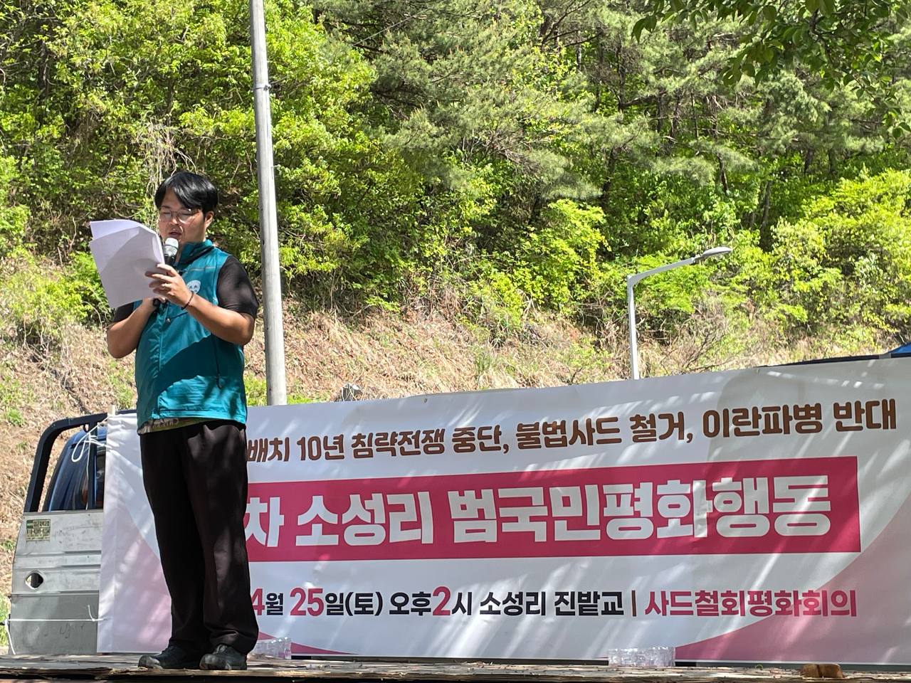 평통사 이우성 청년활동가는 "사드 발사대와 요격미사일이 중동으로 차출됐을 때 언론은 호들갑을 떨었다. 그러나 사드가 있다고 해도 한반도에서 미사일 방어는 근본적으로 불가능하다. 사드는 한국의 안보와 평화를 파괴하는 체계다. 미국이 사드를 한국에 배치한 진짜 목적은 사드 레이더로 북한과 중국의 중/장거리 미사일을 조기 탐지하여 미국 본토와 태평양 미군, 일본에게 정보를 전달하기 위한 것이다. 그래서 사드 발사대와 요격미사일은 중동으로 보내도 레이더는 그대로 둔 것이다. 근본적으로 사드 배치는 한국을 미국과 일본을 방어해주는 전진기지로 전락시킨다. 이재명 정부가 진정으로 한반도의 평화를 원한다면 미국에 맞서 소성리 사드부터 뽑아내야한다. 이 진실을 더 많은 사람들에게 알려나가자. 사드가 나갈때까지 우리의 투쟁도 멈추지 말자."고 발언합니다.