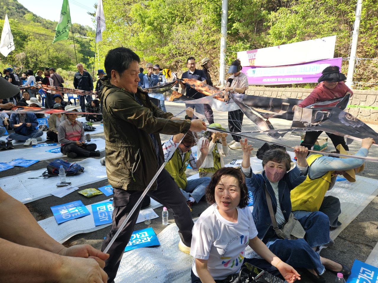 참가자들과 함께 10년가 소성리에 배치되어있는 사드체계가 그려진 50M 현수막을 찢어내는 퍼포먼스를 진행하고 있다