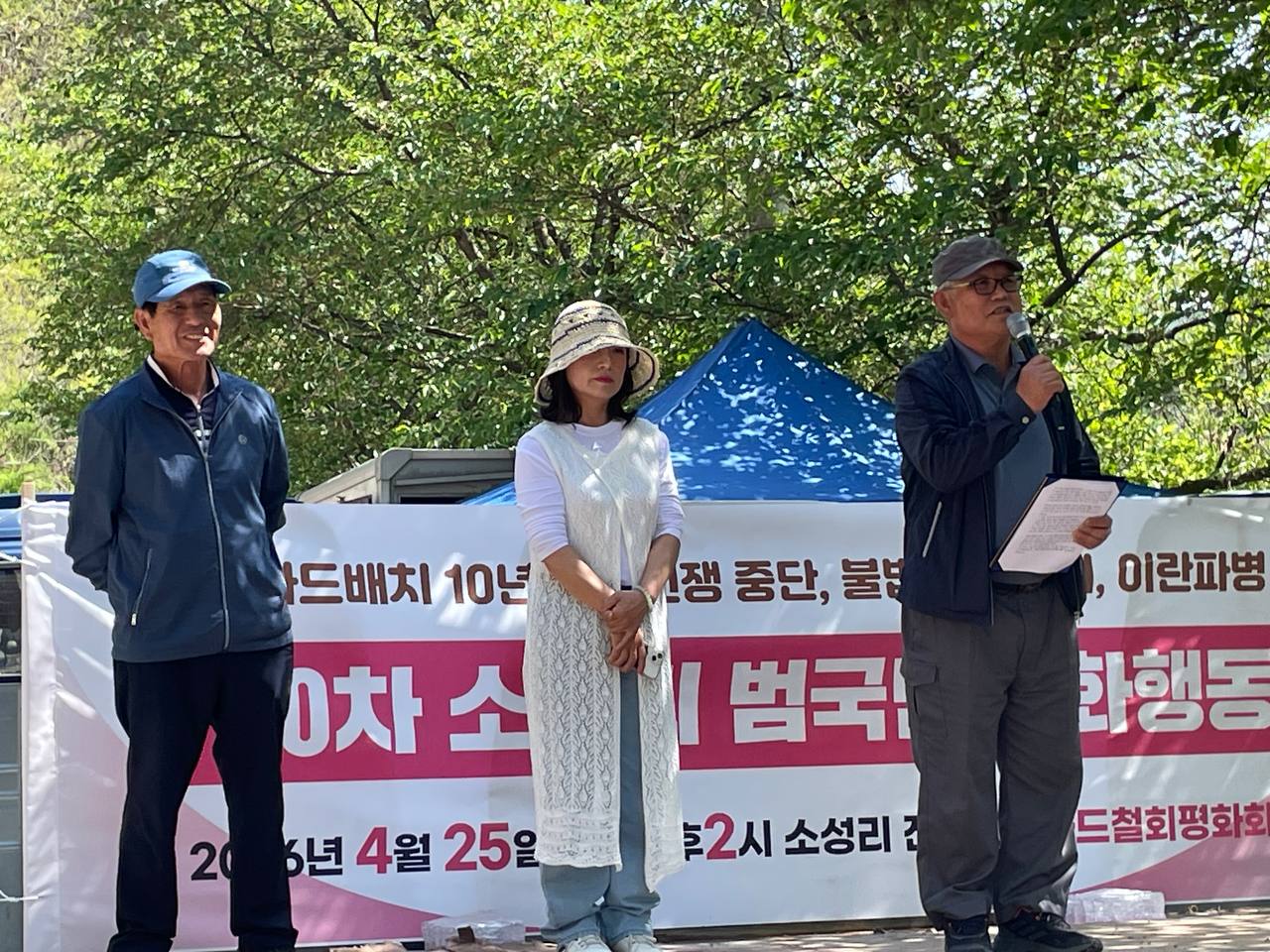 이석주 위원장은 "오늘로 계엄령 같이 경찰을 동원해 사드를 배치한 지 만 10년이 되었다. 이란 전쟁 때문에 사드가 왔다갔다 하는 건 사드가 아무것도 지킬 수 없다는 것을 보여주는 것이다. 세월에 장사 없다지만 오늘 마을 할머니들이 이 자리에 함께 하고 계신다. 평화에 대한 굳은 결의 때문이다. 우리 소성리 주민들은 사드가 철거될 때까지 싸울 것이다."라고 발언합니다.